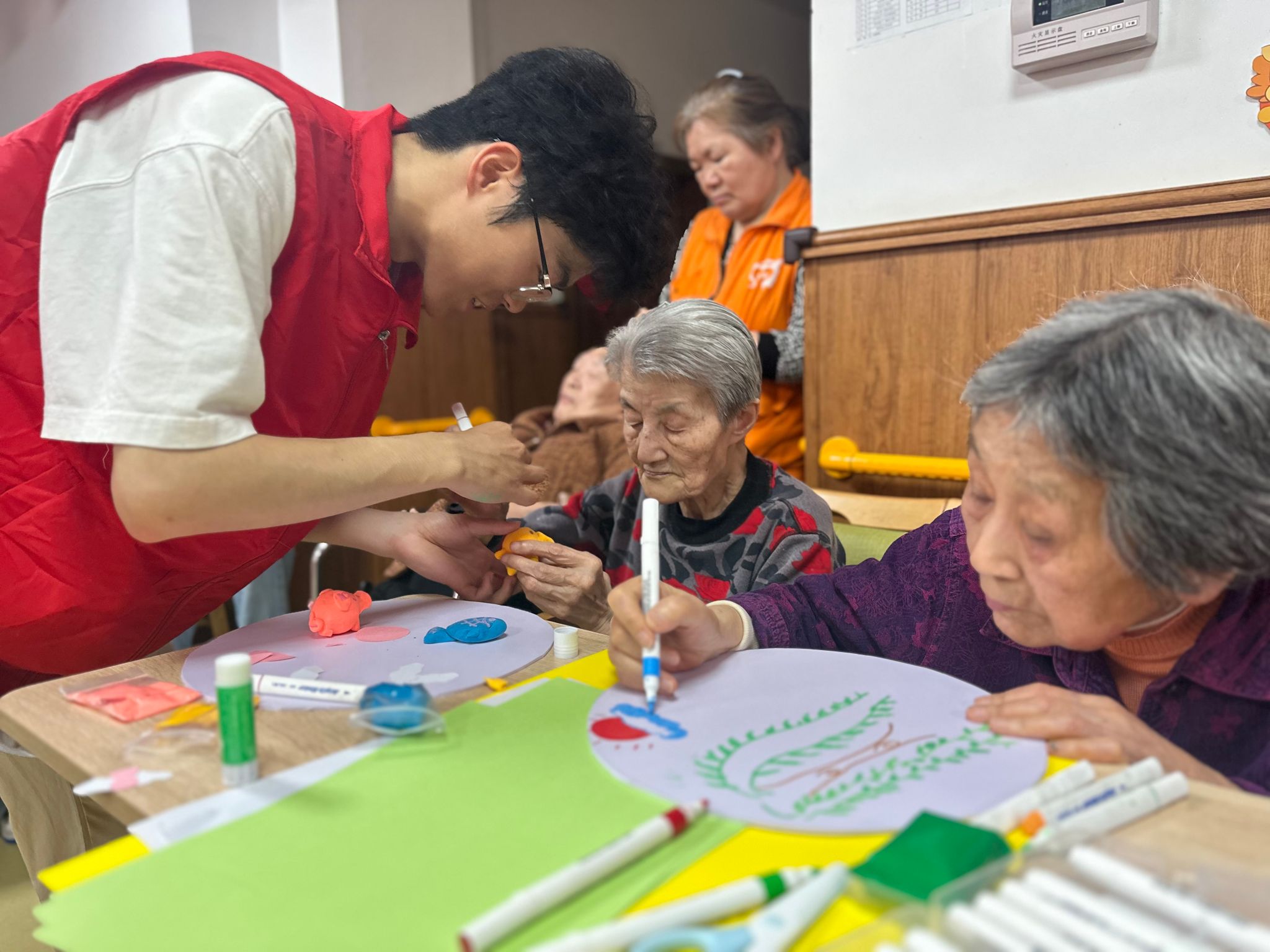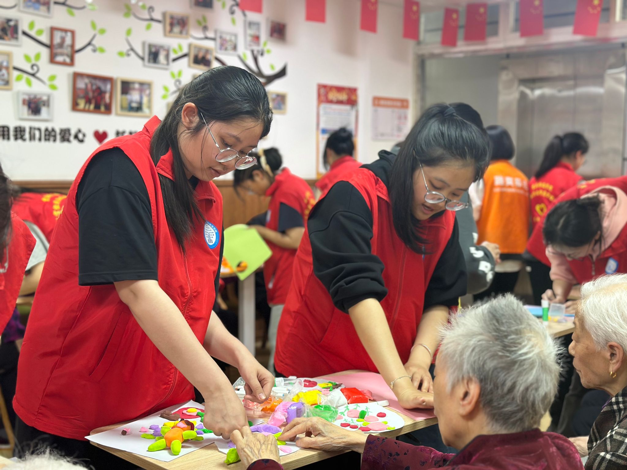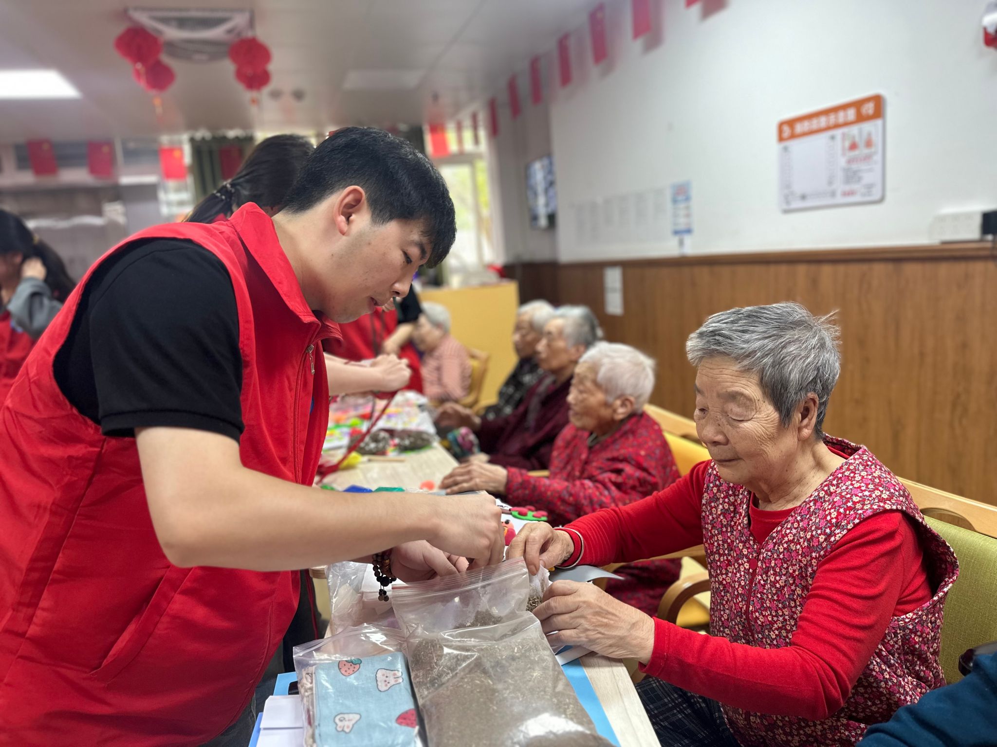 传统文化浸润,唤醒记忆共鸣。活动当日,志愿者们身着红马甲,早早来到路爽桥河养老院,在确认活动材料安全无虞,保证黏土和布料无毒无害后,便开始带领老人进行黏土塑形、圆盘制作和艾草香囊制作。黏土是最原始的媒介,却能创造最深刻的情感联结。我们希望用这种方式,让每个生命的故事都被看见、被珍视。老人们一边动手,一边回忆儿时清明的趣事,欢声笑语回荡在养老院的每个角落,那些沉睡在记忆深处的温暖画面,在志愿者的引导与手作体验中被一一唤醒。