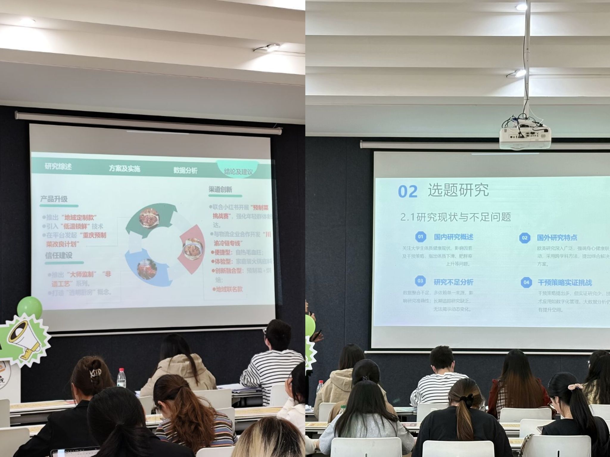 比赛现场,各团队通过实战答辩碰撞出智慧与创新的火花。其中,女子炸弹小队带来的选题“‘欲’启新程,‘正’创食局”,该队通过深入的数据挖掘和严谨的方法分析,获得了评委们的高度赞赏;势如破竹队则选择了“当‘野性消费’遇上国货”这一选题,凭借精准的数据解读和严谨的逻辑推理展现出其专业知识。在答辩过程中,评委老师们秉持专业、负责的态度,就各队伍精心准备的分析报告,从数据来源可靠性、分析方法合理性到结论实用性等多个层面,提出一系列切中要害的问题,并结合行业经验给出建设性建议。这一互动环节不仅是对参赛者专业知识深度与广度的检验,也是对他们临场应变能力、沟通表达技巧的严苛挑战。选手们在与评委的思维碰撞中,进一步明晰自身优势与不足,收获宝贵成长经验。