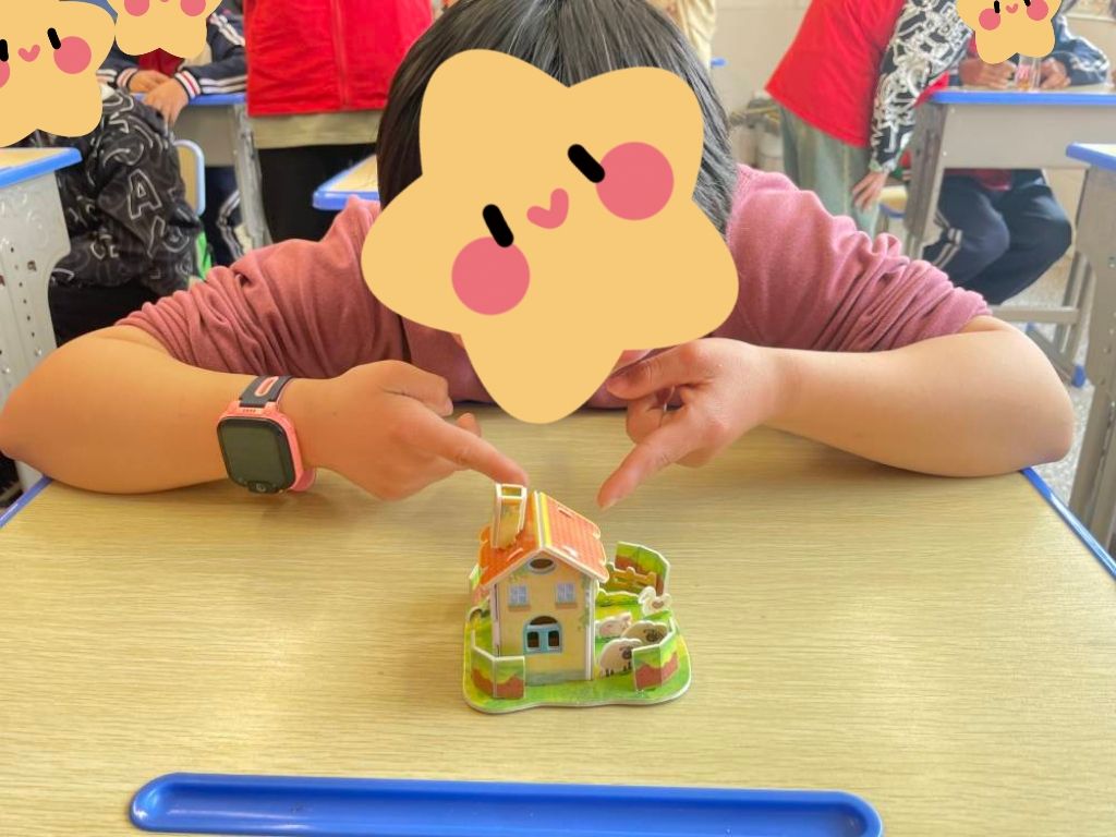 紧接着是立体拼图环节。从搭建小房子到组装卡通动物,孩子们在志愿者的引导下专注比对每一块组件,通过触摸与观察逐步完成作品。立体拼图的趣味性和挑战性激发了孩子们的动手能力与空间思维。一位小女孩指着拼好的拼图俏皮地说:“拼好啦!我的是一个小房子!”