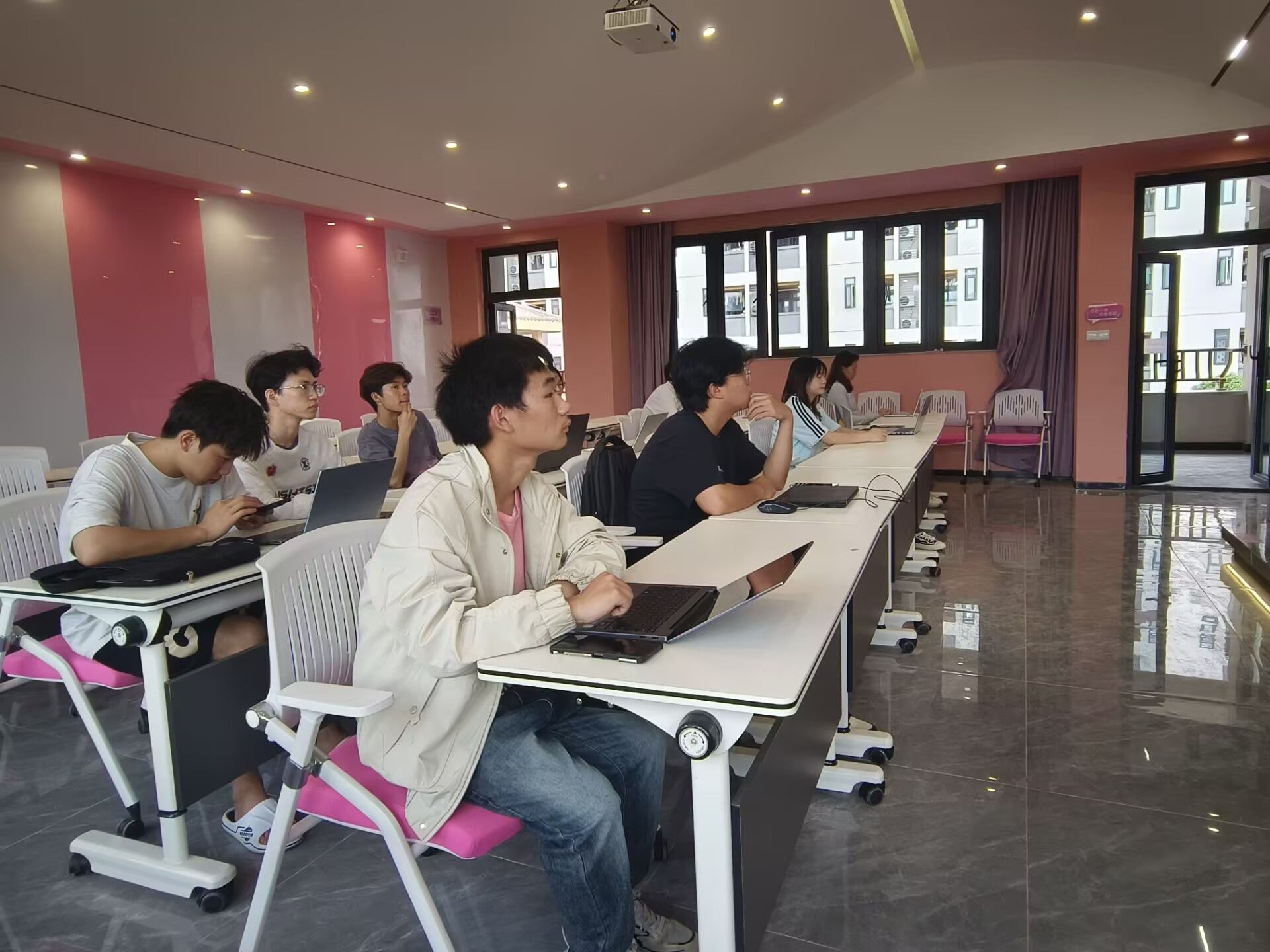 同学们跟随着田老师的节奏又开始学习色彩理论知识和物料设计。田老师深入浅出地阐述了色彩的情感表达和搭配原则,如暖色调传递热情活力,冷色调营造沉稳专业的氛围。紧接着,在版式设计技巧讲解环节,老师借助软件实操演示,介绍了物料设计的几个小tips,学员们目不转睛,认真记录关键步骤。在小组讨论环节,大家围坐在一起,对着手中的设计草图各抒己见,现场思维碰撞激烈,充满了浓厚的交流氛围。