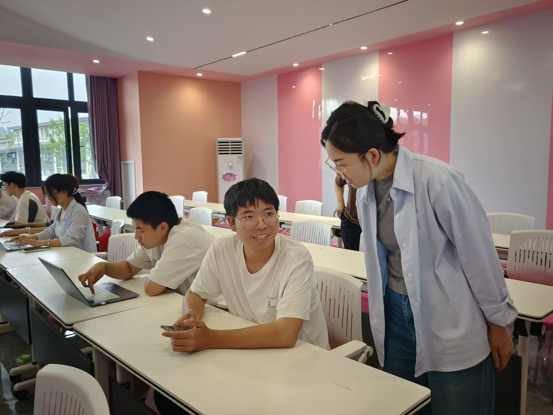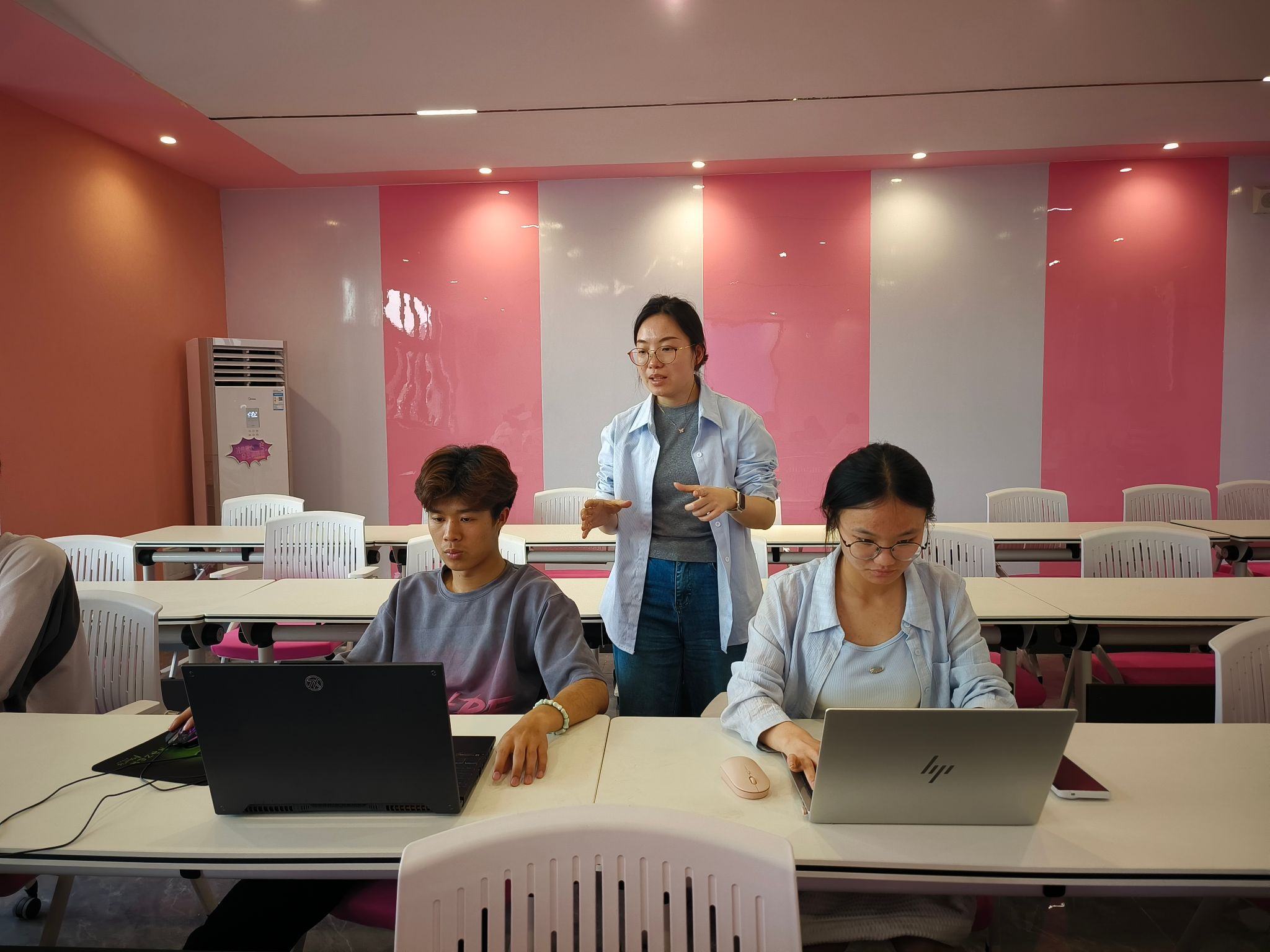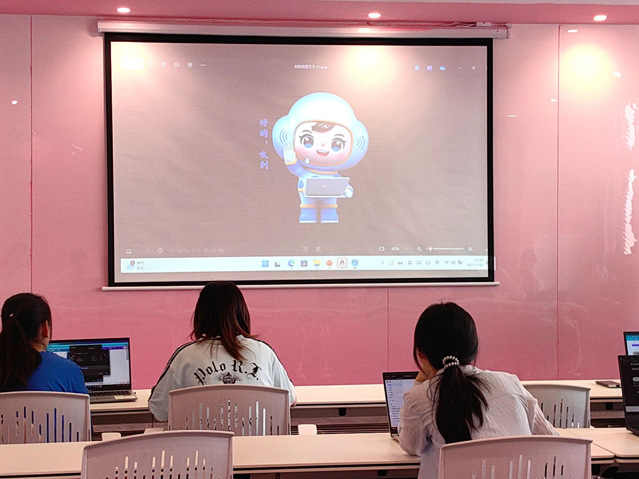 马上进入紧张的案例实操阶段。现场键盘敲击声和鼠标点击声此起彼伏,同学们全神贯注地投入创作。田园园老师穿梭在同学们的中间,及时为遇到问题的学员提供帮助。在规定的创作时间里,学员们运用所学知识,精心构思,绘制草图、选择配色、调整版式。根据学院吉祥物制作表情包。作品展示环节,学员们依次上台介绍自己的设计理念,现场掌声不断。老师从创意、色彩、版式等方面进行点评,给出专业建议,让学员们受益匪浅。