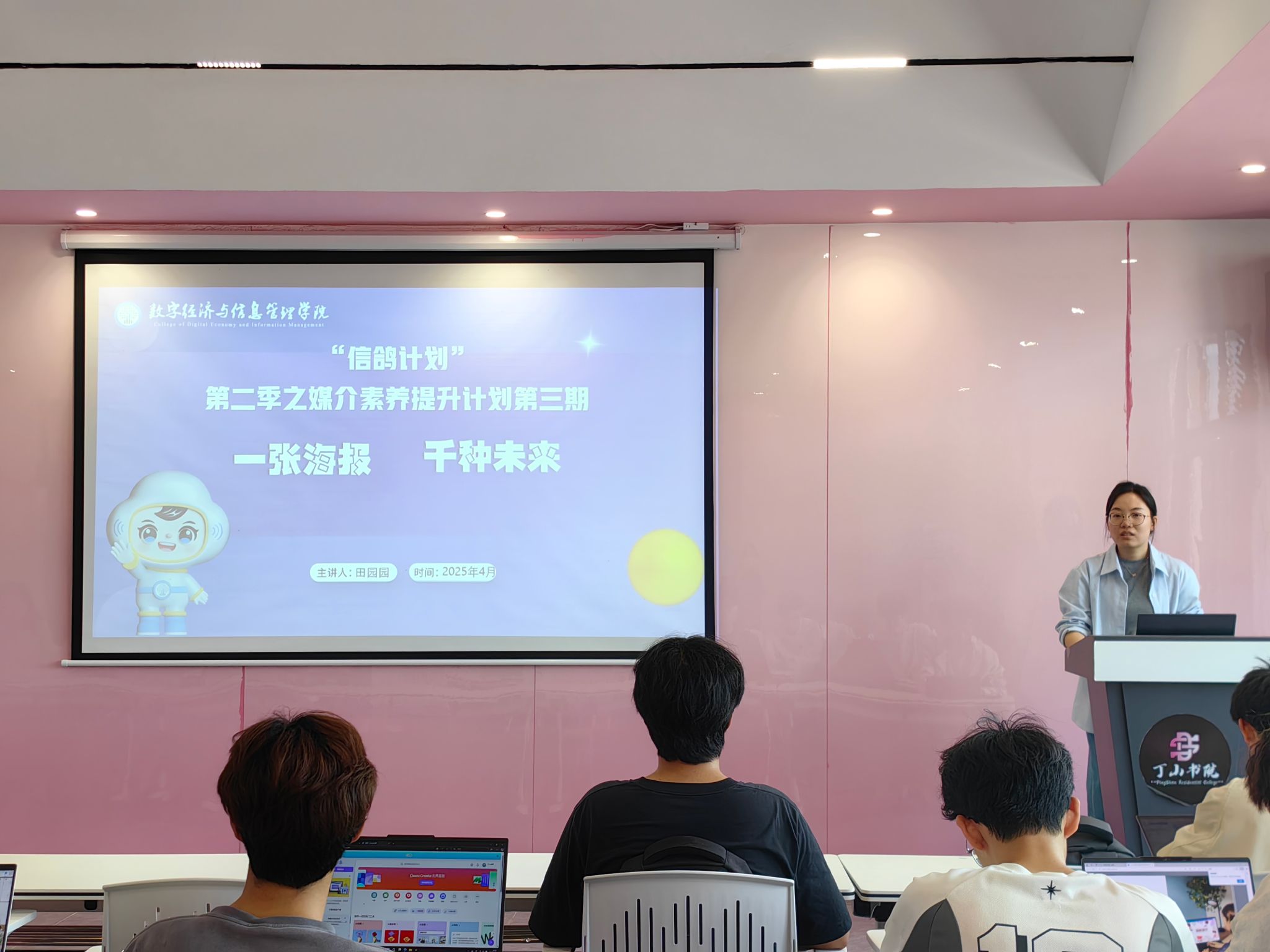 在当今创意与数字化并行的时代,宣传物料设计作为信息传播与视觉表达的重要手段,日益受到关注。为提升同学们在宣传物料设计方面的专业素养,丰富我院文化创作力量,数字经济与信息管理学院特此于2025年4月16日在丁山书院白羊座多功能活动室开展了主题“‘设’想美好,‘计’动青春”信鸽计划媒介素养提升计划第二季第三期。此次培训由学院宣传板块指导老师田园园主讲,旨在通过专业的讲解培训与系统的实践操作,让同学们掌握宣传物料设计的核心技能,点燃大家对设计的热情。