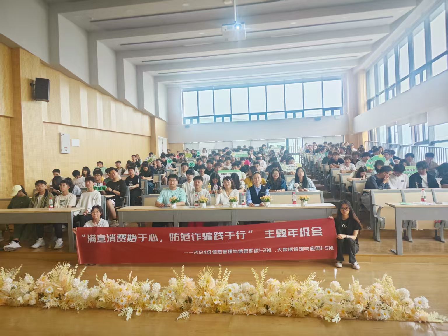 “量入为出,知止有得”,古训中蕴藏的消费智慧,在数字经济浪潮奔涌的当下,与反诈防骗的安全意识共同构筑起青年学子的成长护盾。为帮助学生在复杂消费环境中保持理性,提升反诈“免疫力”,2024级大数据管理与应用1-5班、信息管理与信息系统1-2班全体同学,于2025年4月16日14:00在玉棠书院阶梯教室,以一场别开生面的“满意消费始于心,防范诈骗践于行”主题年级会,奏响安全教育与财商培养的交响曲。綦江区公安局反诈中心宣传员周纯真警官作为特邀嘉宾,为活动注入专业力量。