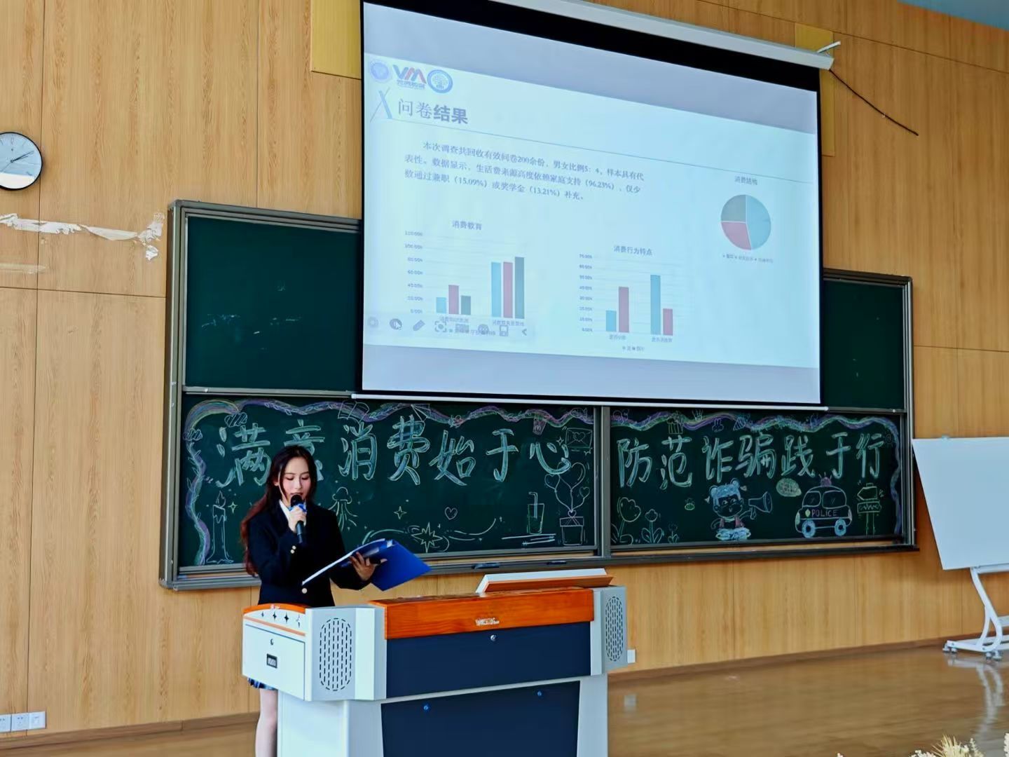 踏入活动现场,温馨氛围扑面而来:阶梯教室外,精心布置的手工工艺品展板与互动打卡墙相映成趣,同学们纷纷驻足拍照,用镜头定格青春笑颜。展板上的手工艺品令人眼前一亮——废弃快递盒化身精致收纳箱,旧衣物重组成创意挂件,这些“变废为宝”的作品,正是同学们曾经冲动消费留下的“痕迹”。大屏幕上循环播放的制作过程录像,将废物重生的奇妙旅程娓娓道来,既唤醒环保意识,也让大家在创作中反思非理性消费行为。随着线上投票通道开启,“最具创意环保作品”评选火热进行,现场气氛持续升温。主持人沈思贝以详实的《大学生消费教育调查问卷》分析作为开场,精准勾勒出年级消费画像,深度剖析潜在诈骗风险,为整场活动奠定扎实的现实基础。