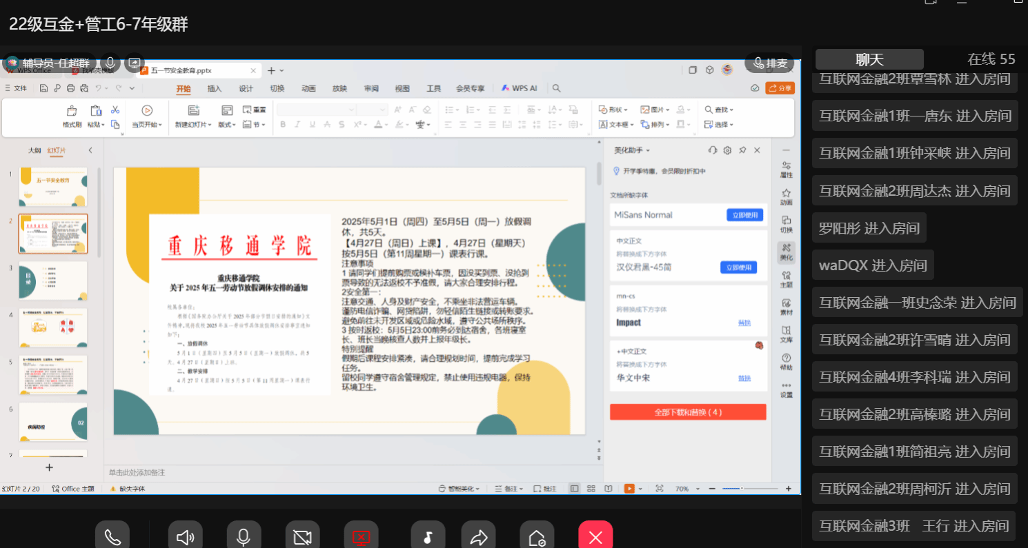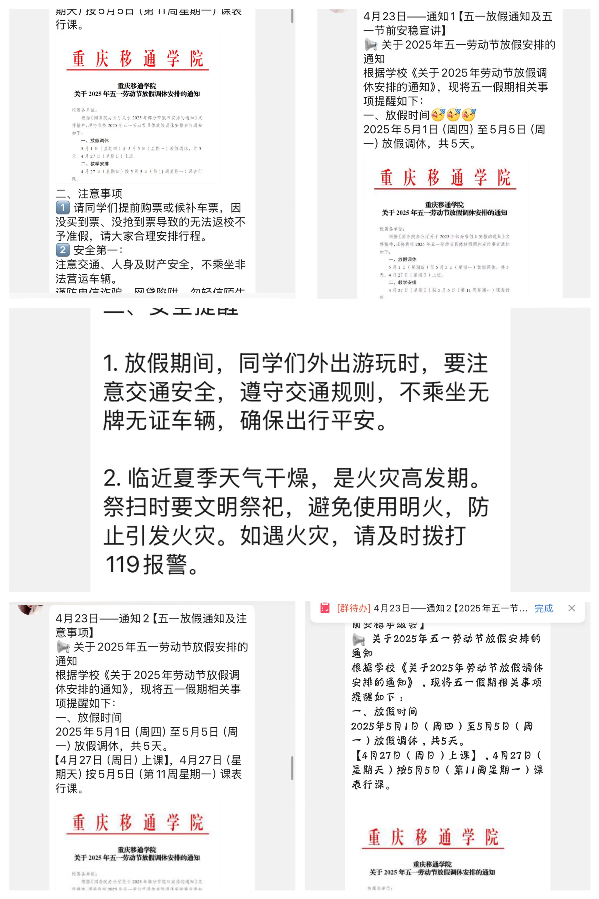 学院重申五一假期请假制度,要求所有离校学生需提前3天通过“智慧学工”系统提交申请,经辅导员审批后方可离校。辅导员特别强调,严禁“先离校后补假”或“擅自延长假期”,确需变更行程需及时报备;4月30日下午,各班级将统一核查留校学生名单,确保“一人一档”动态管理。对于无故缺勤者,学院将依规严肃处理。