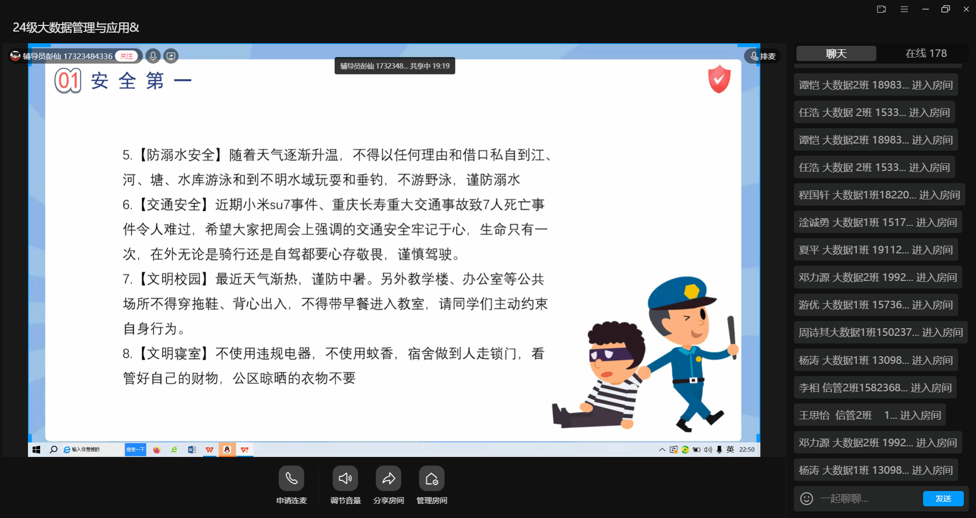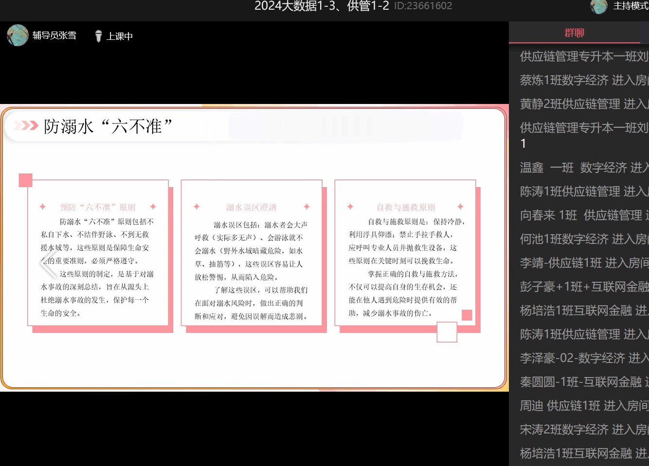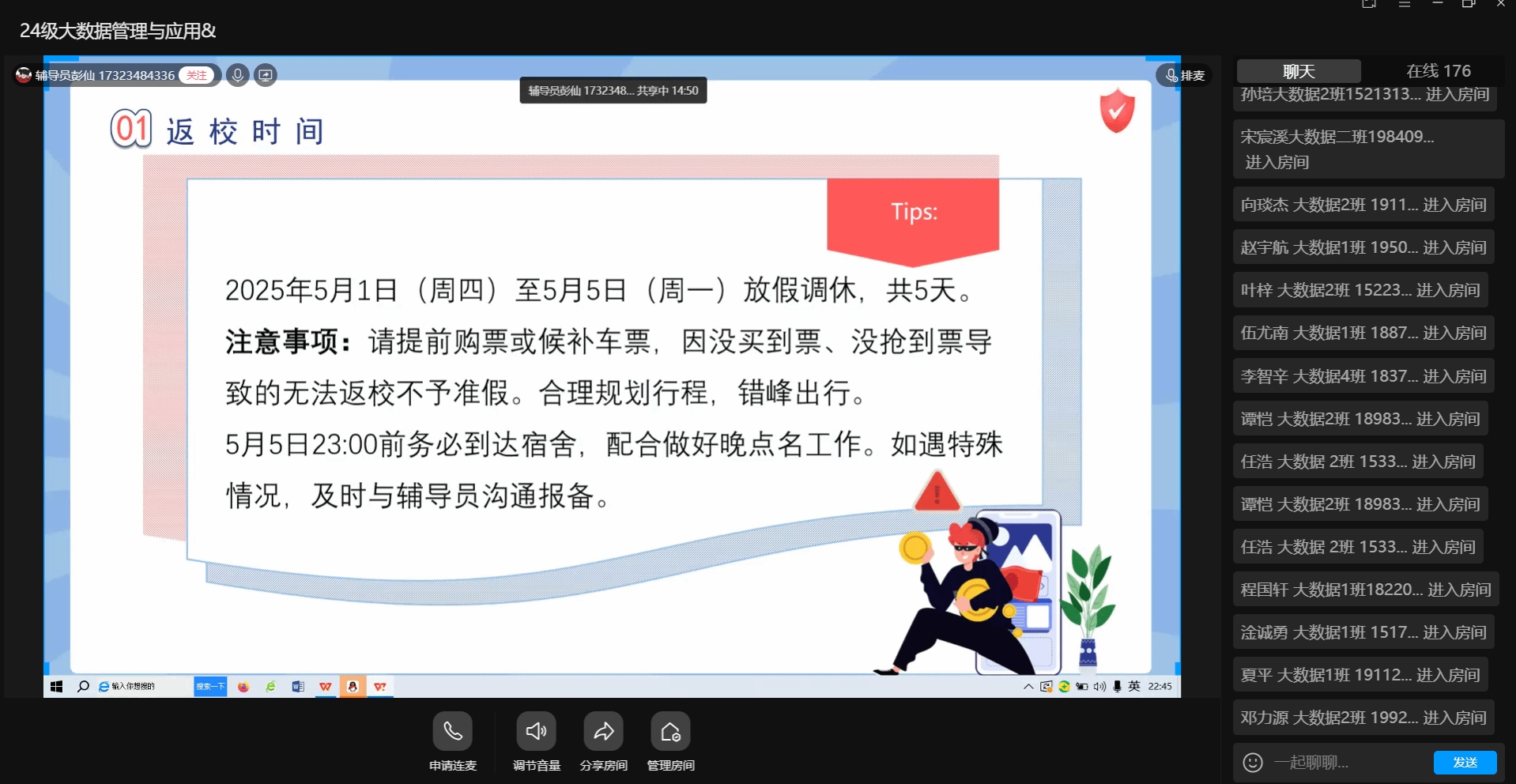 五一假期临近,为增强学生安全意识、防范潜在风险,确保全体学生度过平安祥和的假期,4月28日下午,数字经济与信息管理学院组织全体辅导员在4月25日-4月28日期间召开“五一假期安全教育系列会议”,面向全院学生开展节前安全教育活动,强调“安全无小事,防范于未然”,要求辅导员通过主题年级会、线上宣传等形式全覆盖落实安全教育。
