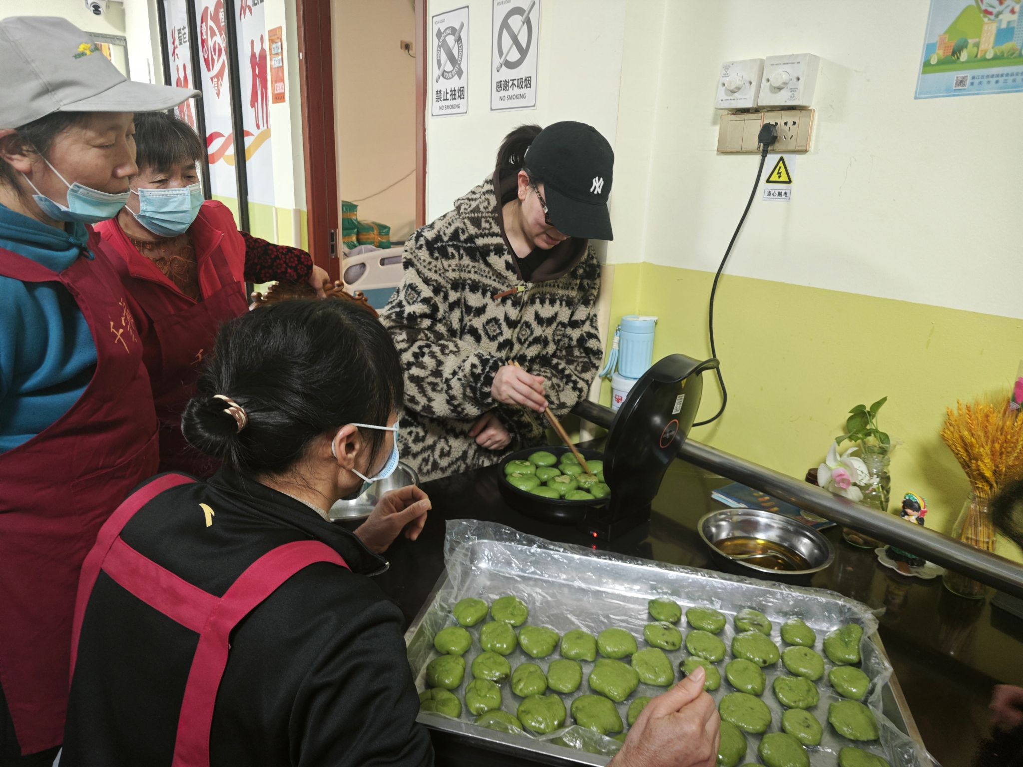 “青团粉要慢慢加,揉面像搓衣裳一样用巧劲。”带上一次性手套的志愿者化身“厨艺老师”,将青团制作分解为“调、揉、包、搓”四步。考虑到老人动手能力,支队特别改良工艺:提前备好半成品青团粉,在养老院阿姨的帮助下,揉出了可可爱爱的面团。志愿者和老人们闲聊着,在爷爷奶奶和阿姨的指导下,经过半个多小时,盘子里终于摆满了一个个小青团。