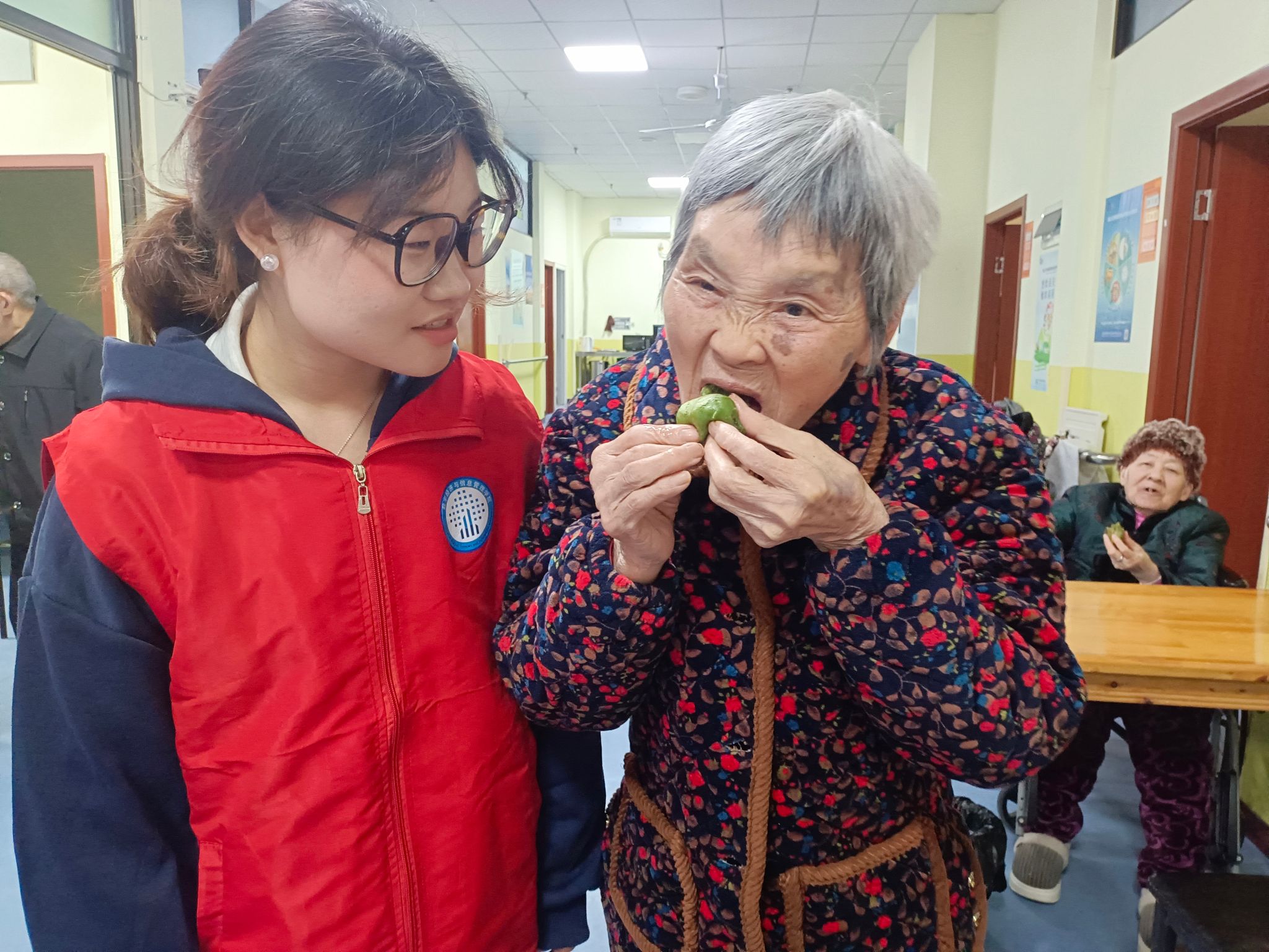 蒸笼雾气袅袅升起,志愿者与老人围坐闲话家常。“我年轻的时候在大队和姐妹们采艾草,满山绿得像泼了颜料……”奶奶的回忆引发共鸣,老人们纷纷分享扫墓踏青、挖野菜、编柳帽的往事。随着青团出笼,志愿者贴心将青团切成小块,方便老人食用。咬一口碧玉般的团子,艾草清香弥漫舌尖,爷爷奶奶们连赞:“甜而不腻,好吃!”