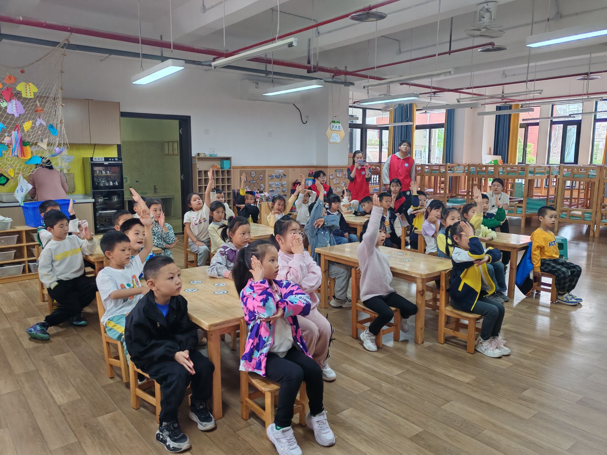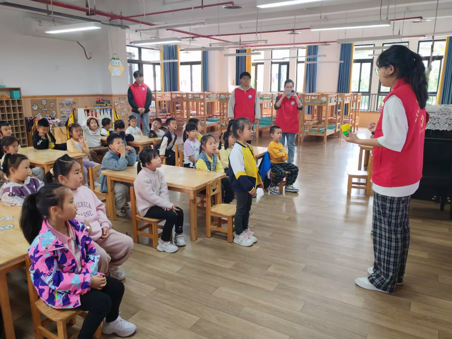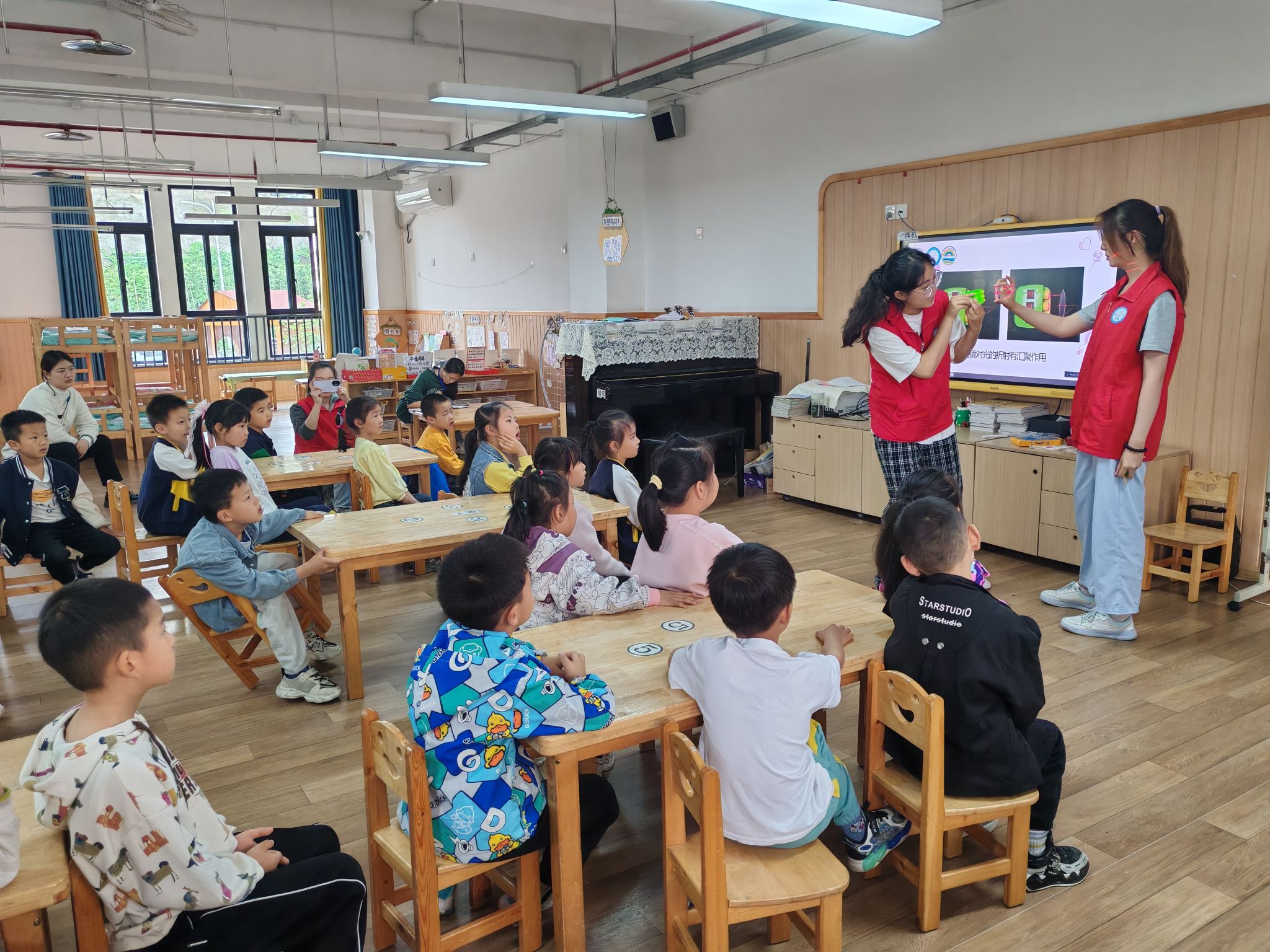 最受欢迎的环节当属“创造彩虹”。志愿者们通过生动的图片和视频,向小朋友们展示彩虹形成的科学奥秘。当屏幕上出现彩虹的慢镜头分解画面时,孩子们不约而同地发出"哇"的惊叹声,有个小男孩兴奋地指着投影仪喊:"快看!彩虹在跳舞!"志愿者用通俗易懂的语言解释阳光穿过雨滴就像通过三棱镜一样,会被分解成七种颜色。当问到“谁见过彩虹"时,孩子们争先恐后地举手,七嘴八舌地分享自己在雨后、喷泉边看到彩虹的经历,教室里洋溢着发现科学奥秘的欢乐氛围。活动尾声,志愿者通一问一答的方式帮助孩子们复习知识,小朋友们踊跃举手,每位孩子都获得属于自己的奖品。