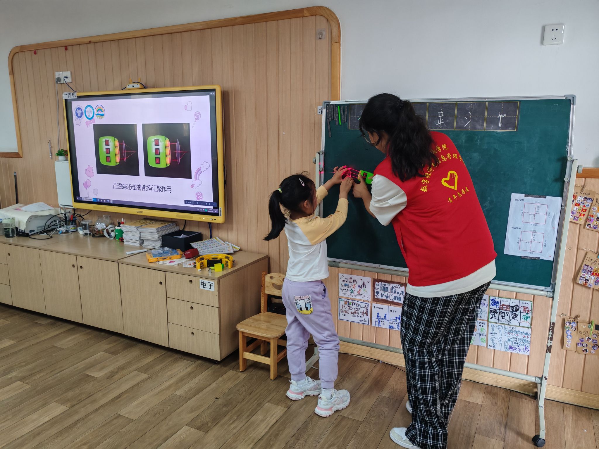 “光的折射”环节则充满视觉惊喜。志愿者们通过两个视频更直观的解释光的折射,利用图片和实验视频,向孩子们展示光在不同介质中的传播变化。小朋友们瞪大眼睛,发出“哇——”的惊叹。当看到光在水面“拐弯”时,他们兴奋地指着屏幕喊:“快看!光会转弯!”“像魔法一样!”有个孩子甚至模仿光线扭动身体,逗得大家哈哈大笑。