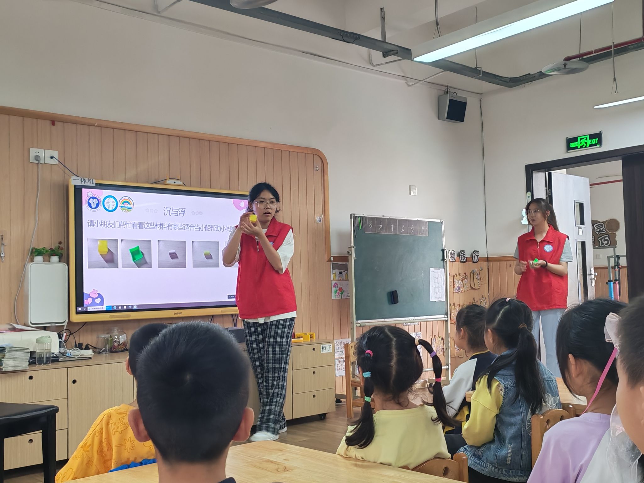 活动以“沉与浮”的趣味实验拉开序幕。志愿者们化身“故事讲师”,借助小蚂蚁过河给朋友送礼物的故事引导小朋友们参与思考,并通过播放趣味动画视频的方式和用简单易懂的语言,结合生活中的例子,引导小朋友们思考浮力的原理。通过对生活现象的观察,抽象的物理概念变得有趣起来,科学的种子在小朋友们的心中悄然发芽。