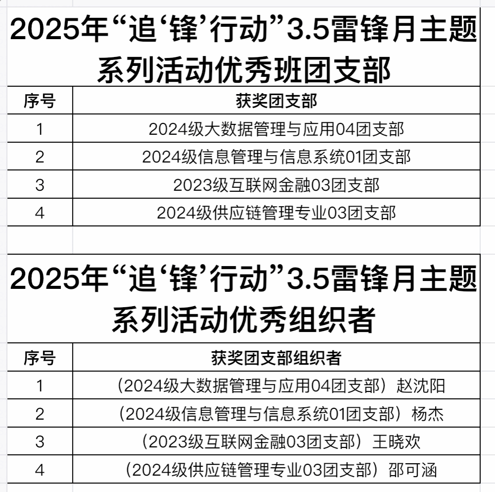 在2025年“追‘锋'行动”雷锋月里,班级团支部共开展活动22场,根据各团支部活动的组织情况、参与度、创新性及实际成效等多方面因素,进行综合评估,2024级大数据管理与应用04团支部等四个集体荣获2025年“追‘锋’行动”3.5雷锋月主题系列活动优秀班团支部,赵沈阳等四位同学荣获2025年“追‘锋’行动”3.5雷锋月主题系列活动优秀组织者。