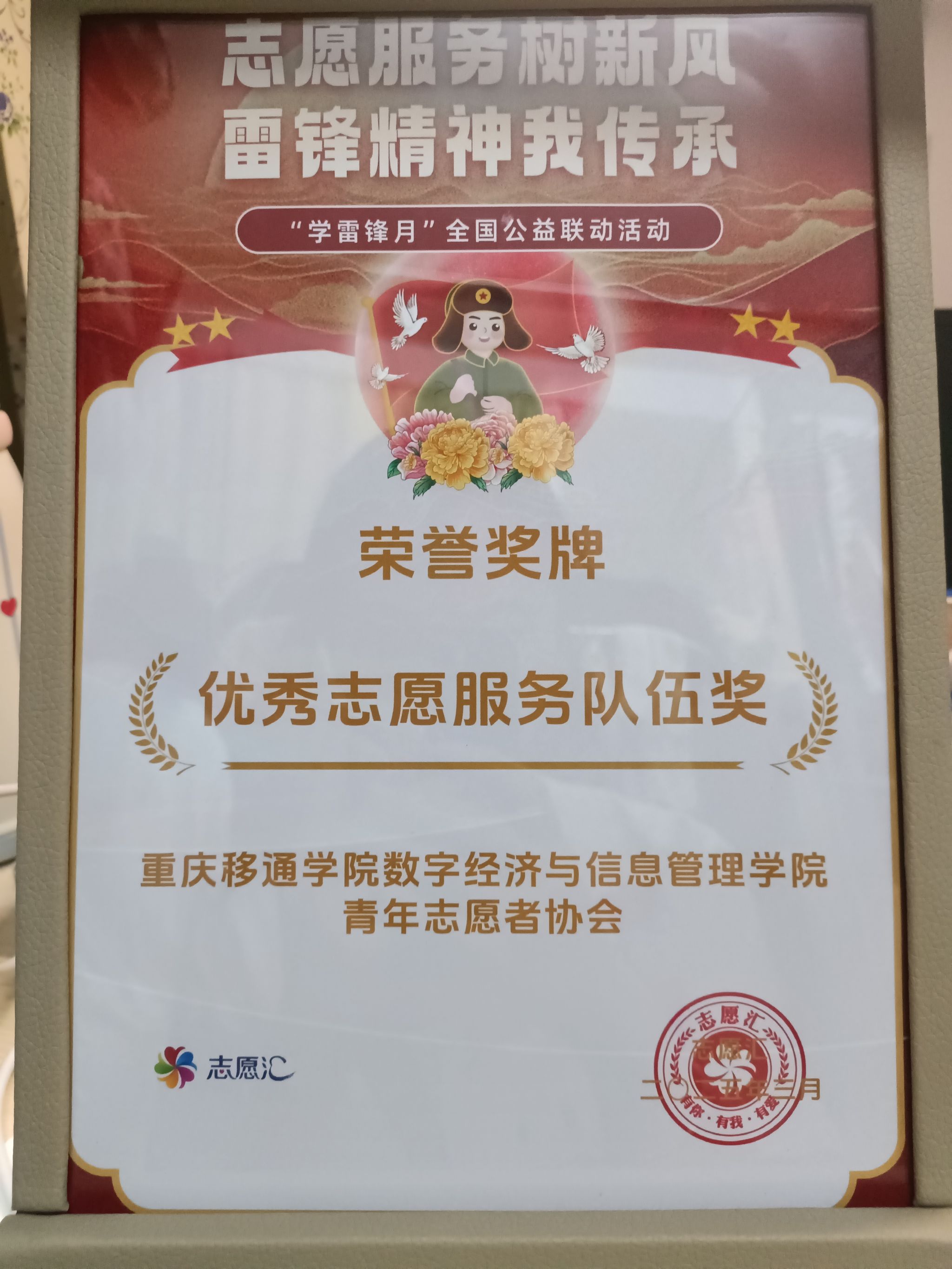 为认真落实习近平总书记关于深入开展学雷锋活动的重要指示,深入学习宣传贯彻党的二十大精神,弘扬“奉献、友爱、互助、进步”志愿精神,数字经济与信息管理学院积极开展各种志愿服务活动,投身志愿服务事业,在2025年“学雷锋月”全国公益联动活动中,数字经济与信息管理学院青年志愿者协会荣获“优秀志愿服务队伍奖”。