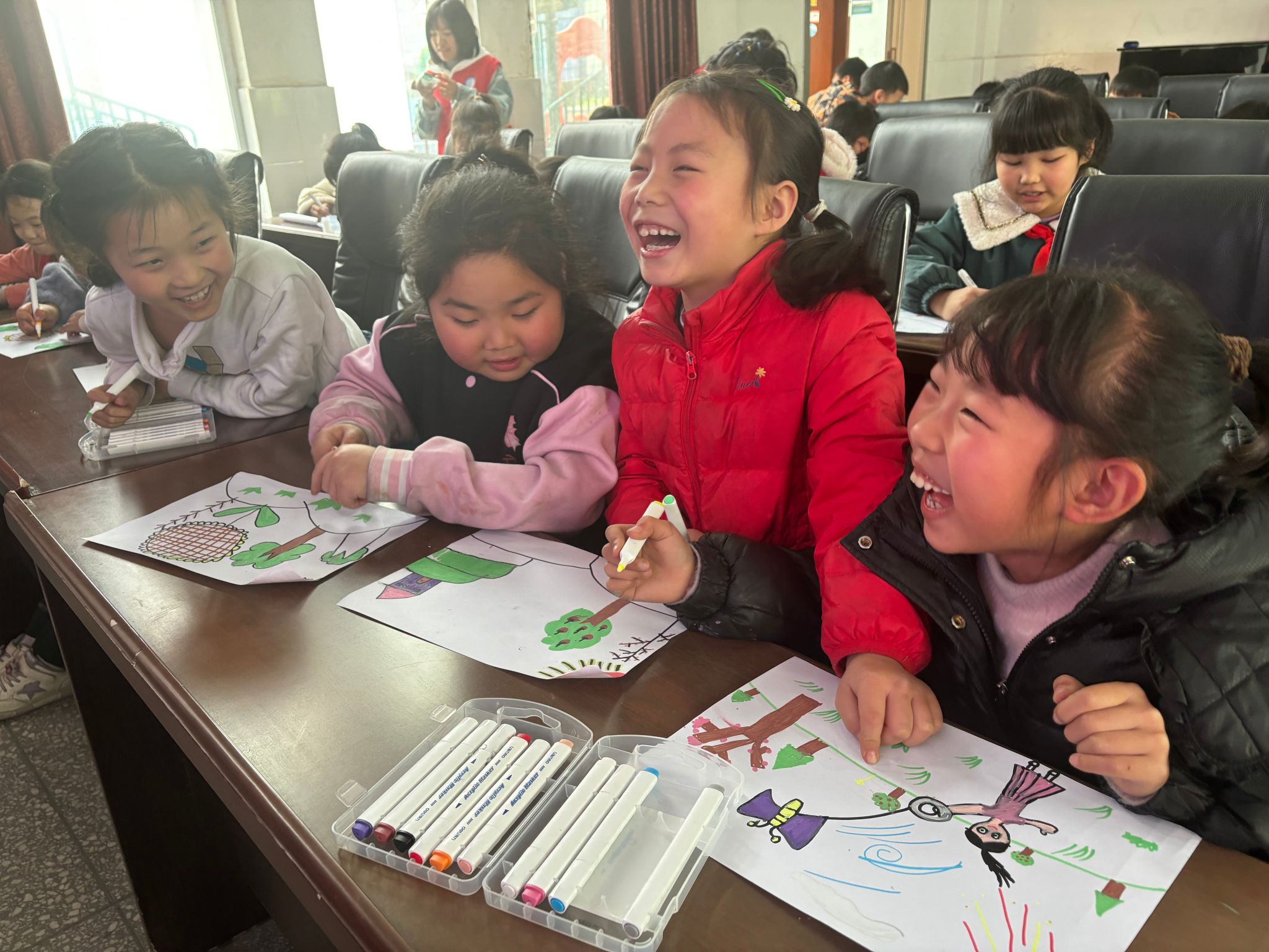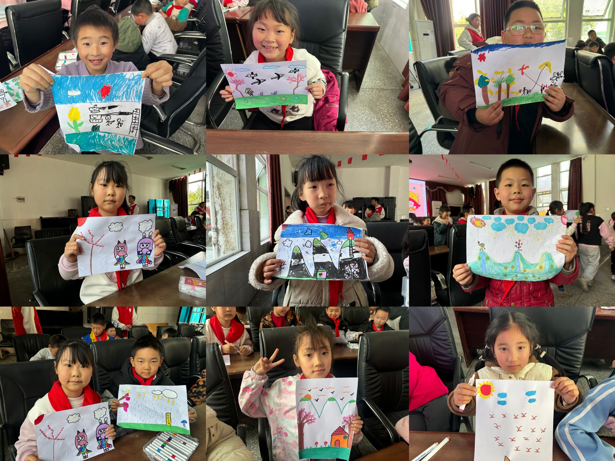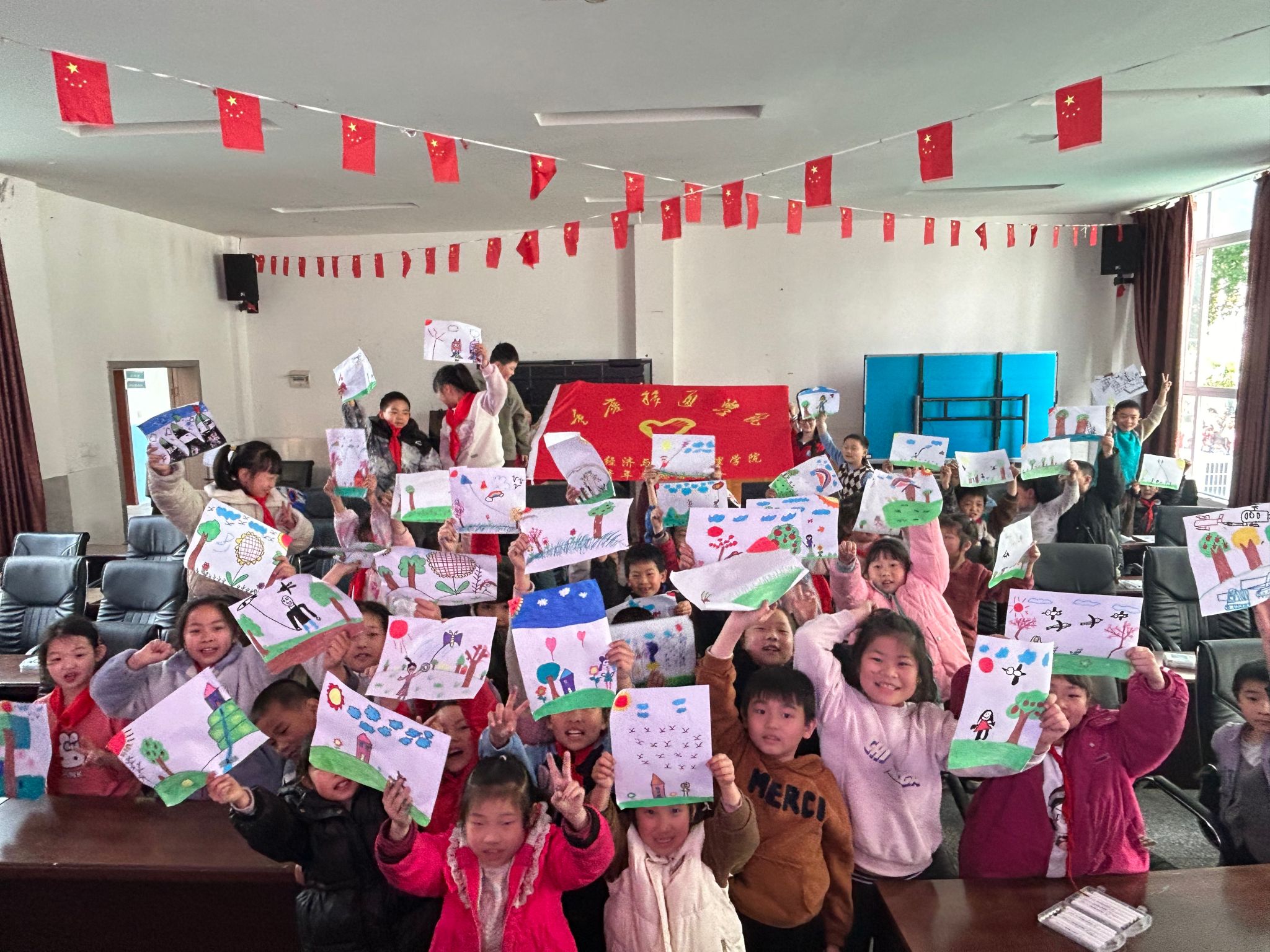 随后进入创意绘画时间,志愿者们为每位学生分发了绘画工具。主持人以“我眼中的春天”为主题,引导孩子们将观察与想象结合。有的用蜡笔勾勒出破土而出的嫩芽,有的用水彩晕染出烟雨朦胧的梯田,志愿者们在画架间穿行指导时,发现不少作品都融入了刚学到的节气元素:斜斜的电线杆上栖着归来的燕子,田间竖着象征春分的彩蛋。