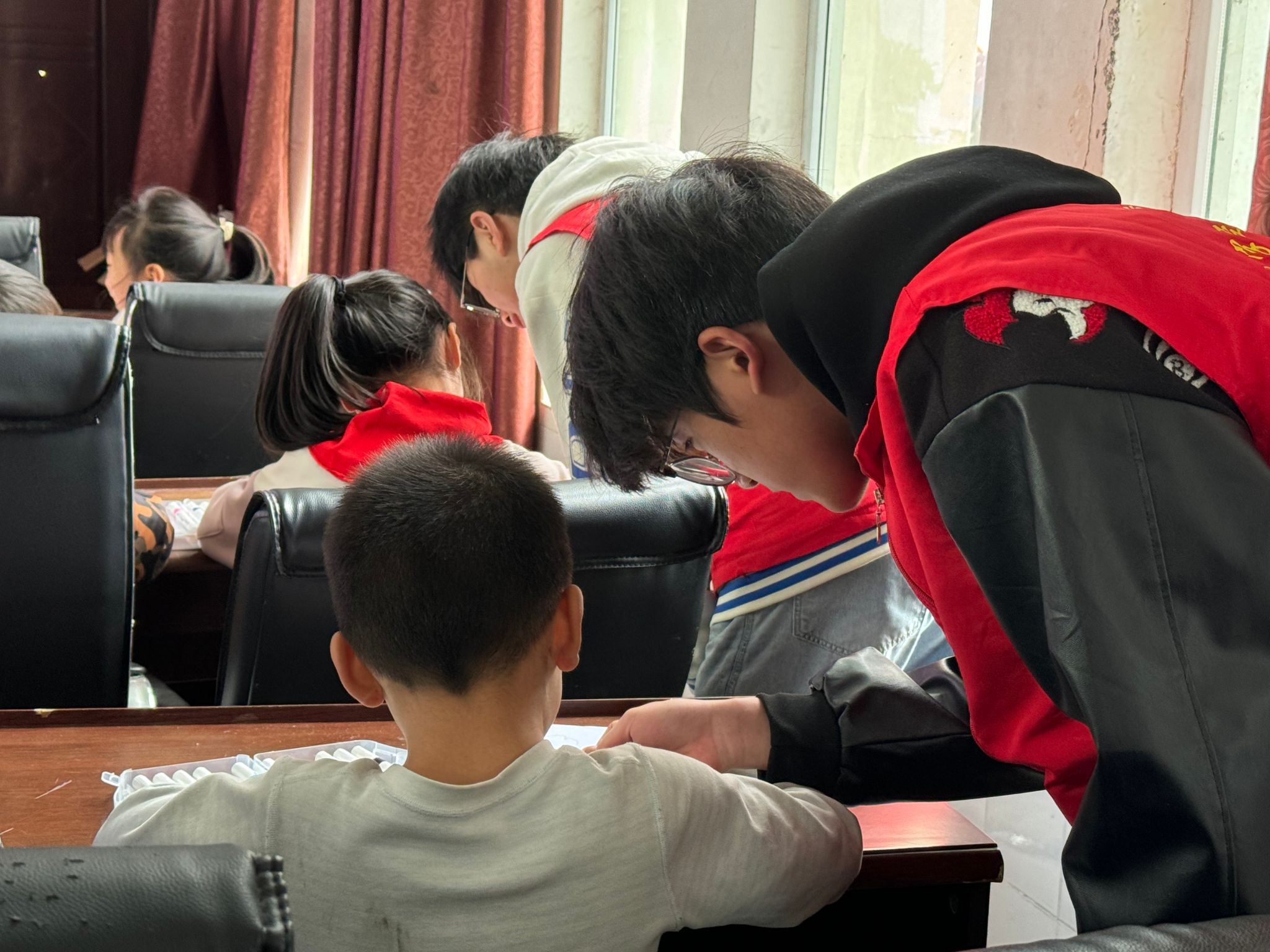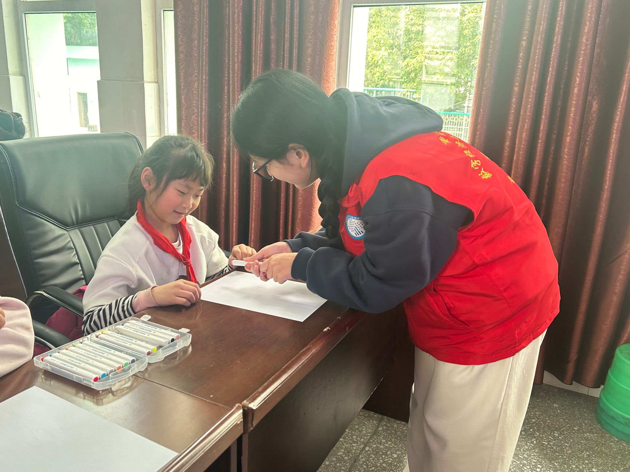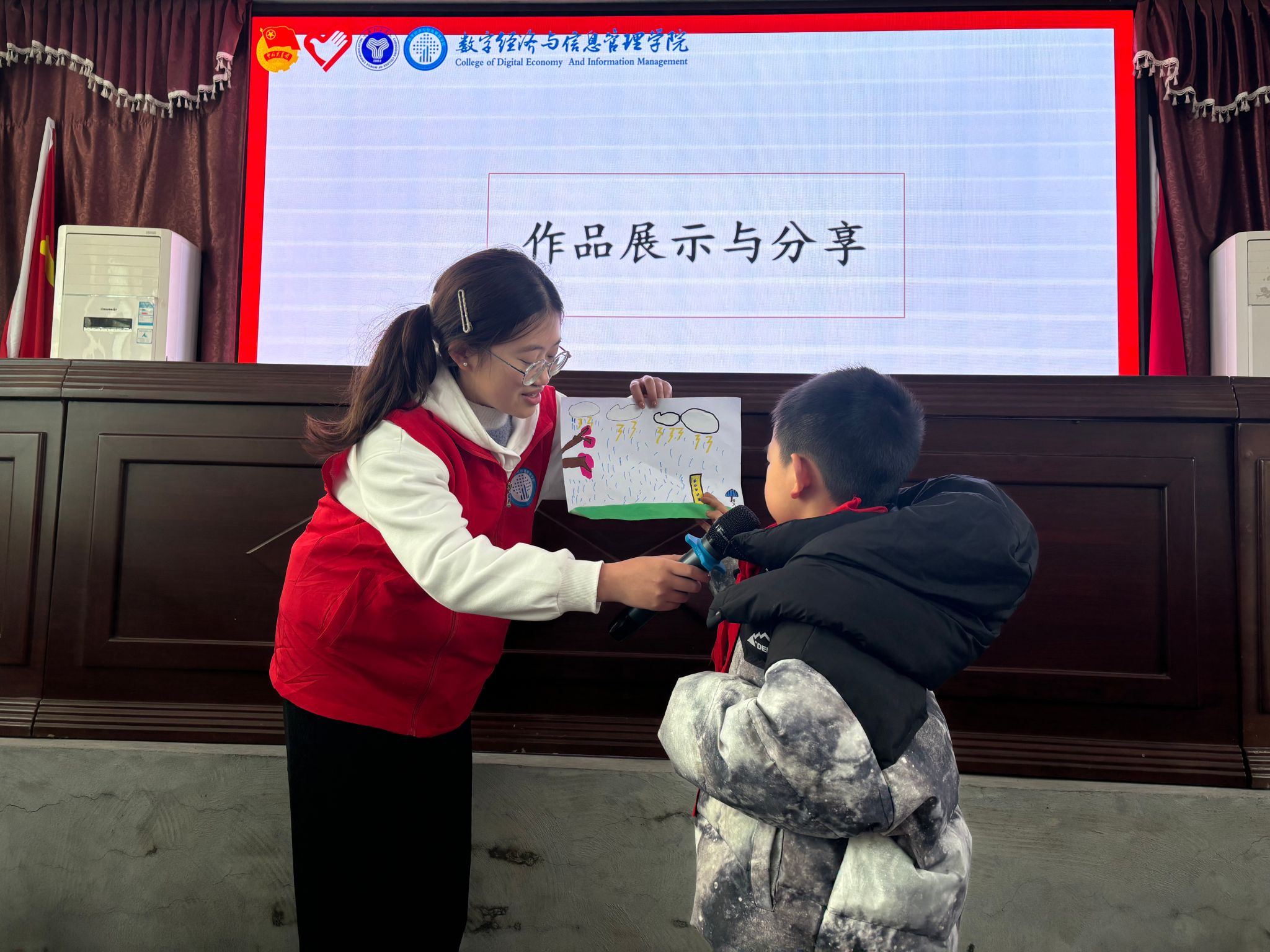 随后进入创意绘画时间,志愿者们为每位学生分发了绘画工具。主持人以“我眼中的春天”为主题,引导孩子们将观察与想象结合。有的用蜡笔勾勒出破土而出的嫩芽,有的用水彩晕染出烟雨朦胧的梯田,志愿者们在画架间穿行指导时,发现不少作品都融入了刚学到的节气元素:斜斜的电线杆上栖着归来的燕子,田间竖着象征春分的彩蛋。