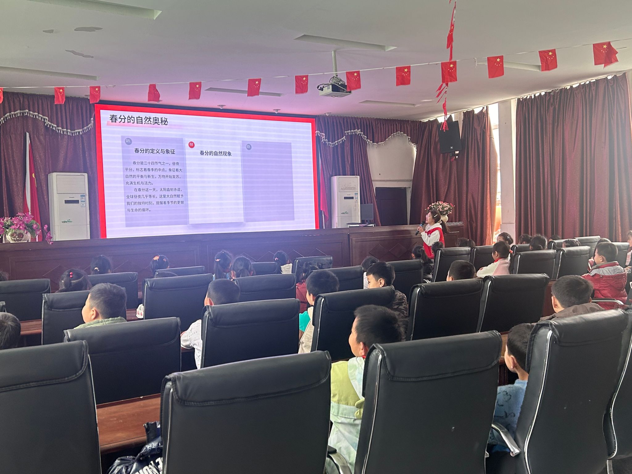 活动伊始,主持人李欣瑶以生动讲解带领同学们走进春分文化的世界。她从“昼夜均分”的自然规律切入,通过“竖蛋迎春”的趣味现象引发孩子们的好奇,随后以春分三候——玄鸟至、雷乃发声、始电为脉络,将候鸟迁徙、春雷萌动等物候特征娓娓道来。在展现节气与农耕文明的关系时,主持人不仅讲述了农时谚语“春分麦起身,一刻值千金”的深意。当投影幕上出现孟浩然“春眠不觉晓”的诗句时,课堂氛围达到高潮,孩子们争相背诵自己学过的春日诗篇,清脆童声里激荡着传统文化的回响。