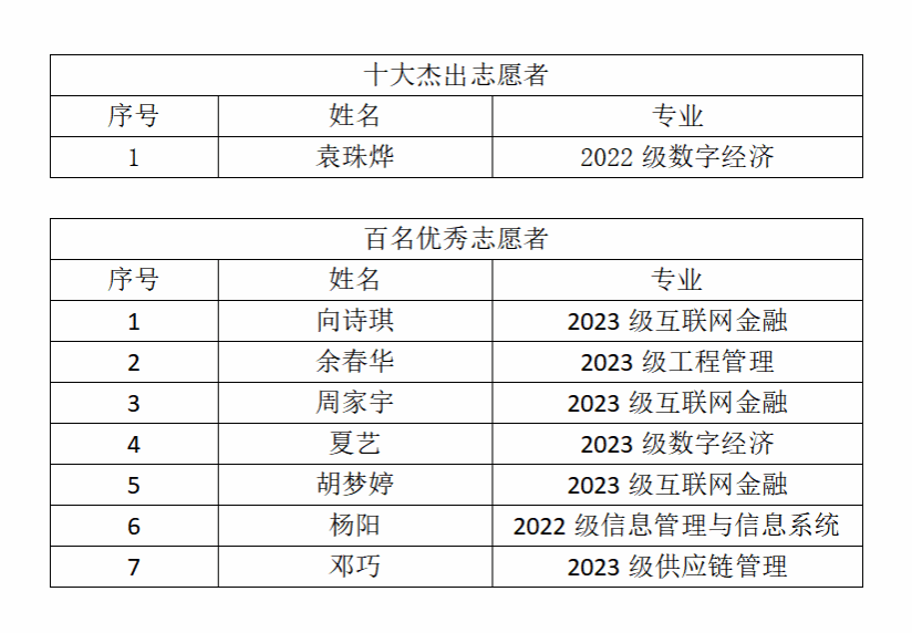 为彰显新时代新青年风采,激发广大青年跻身志愿服务行列,积极发挥优秀个人榜样示范及引领作用,推动我院志愿服务事业的长远发展。通过对各青年志愿者的志愿时长认定、在志愿服务中的贡献程度,以及由学工副院长任瑞娟老师、团总支书记和志愿服务板块指导老师的评选下,现决定推选袁珠烨为十大杰出青年志愿者,杨阳、向诗琪、余春华等十名同学为百名优秀志愿者,具体名单如下(排名不分先后):