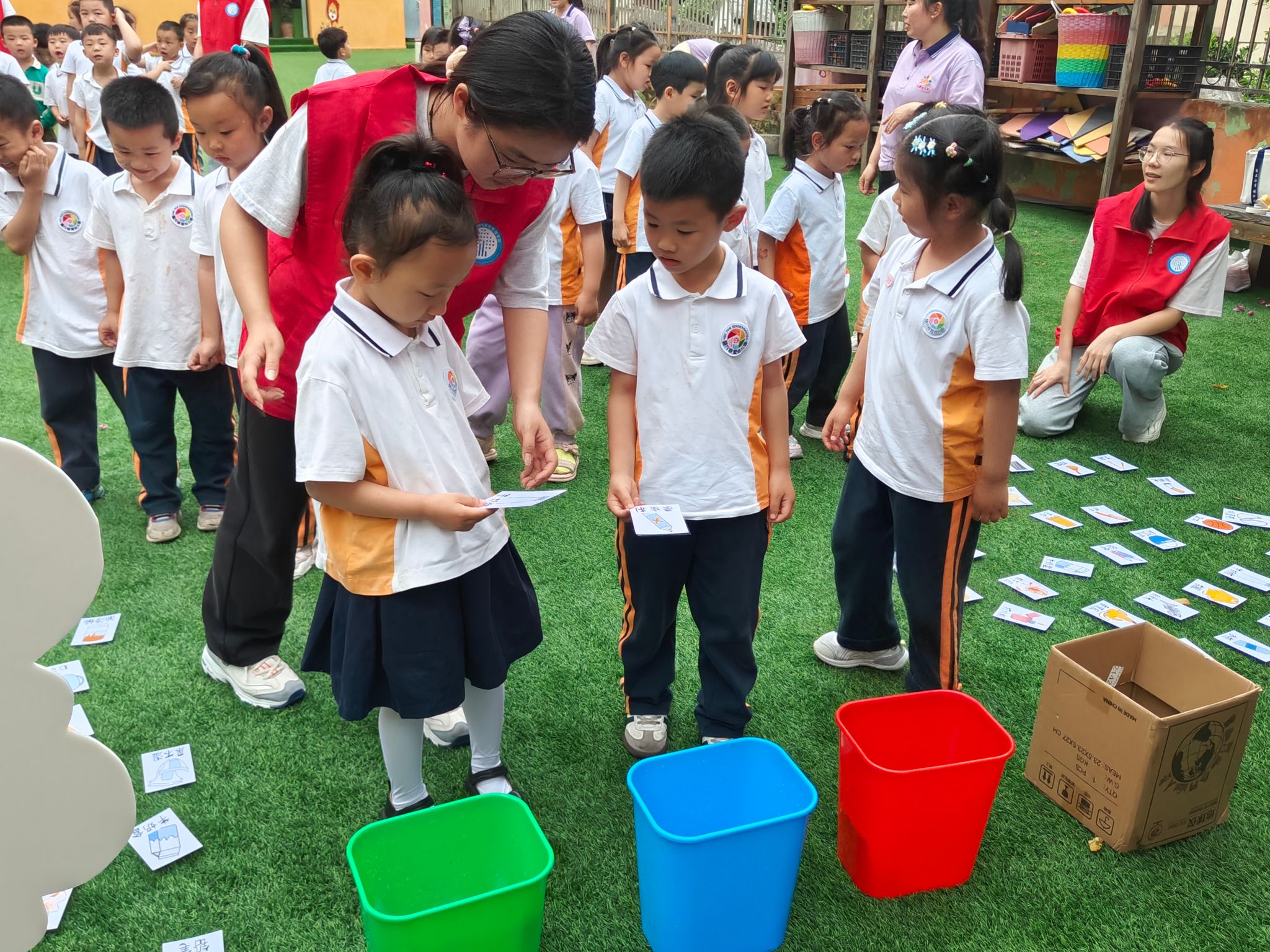 “预备——开始!”随着志愿者一声令下,7支身着不同颜色队服的小队冲向“垃圾大树”展板。孩子们踮脚摘下“香蕉皮”“废电池”“旧报纸”等卡片,小跑至对应垃圾桶前,一边踮脚张望分类标识,一边用稚嫩的童声讨论:“这个应该放绿色垃圾桶!”“不对,废电池是红色的!”