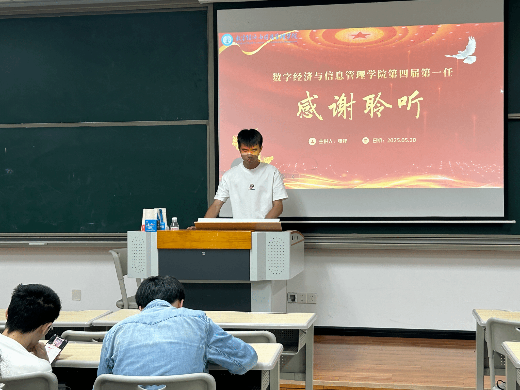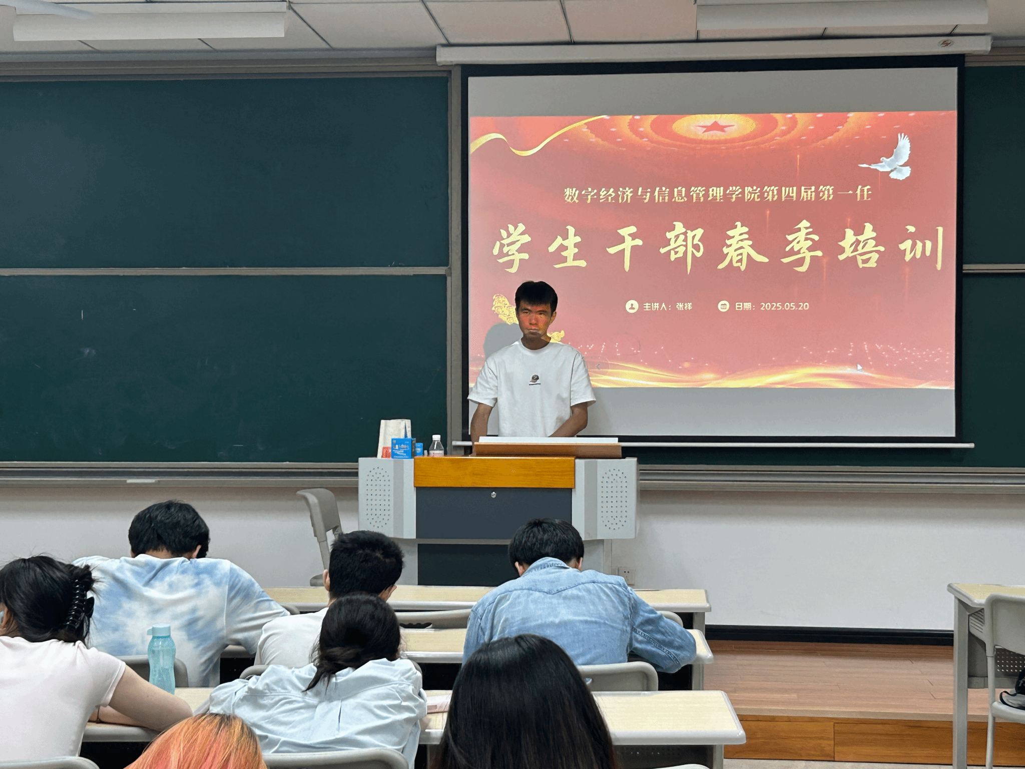 2025年5月20日,数字经济与信息管理学院在仁者楼405举办了第四届第一任学生干部春季培训活动。本次培训由学院学生会主席张祥主讲,旨在进一步明确学生干部的角色定位与职责,提升学生干部的综合素质与工作能力。