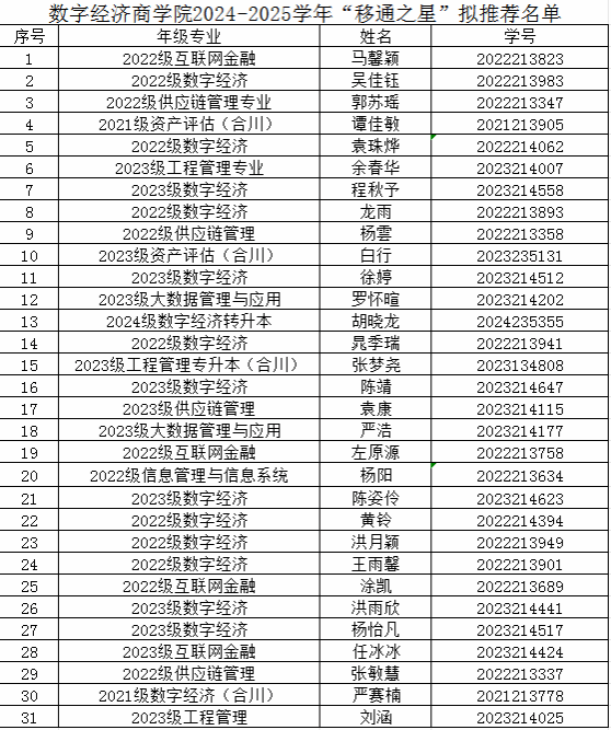 为深度挖掘活跃在完满教育各级各类活动中的学生典型,引导和激励广大移通学子积极参与完满教育活动,充分发挥学生榜样的作用,营造比学赶超的积极氛围,根据《重庆移通学院“移通之星”评选表彰办法》文件精神,我院已启动2024-2025学年“移通之星”评审工作,经过前期自主报名,7类奖项共有54人提交材料,经过综合评审,拟推荐以下同学进入校级候选,现将入围名单公示如下: