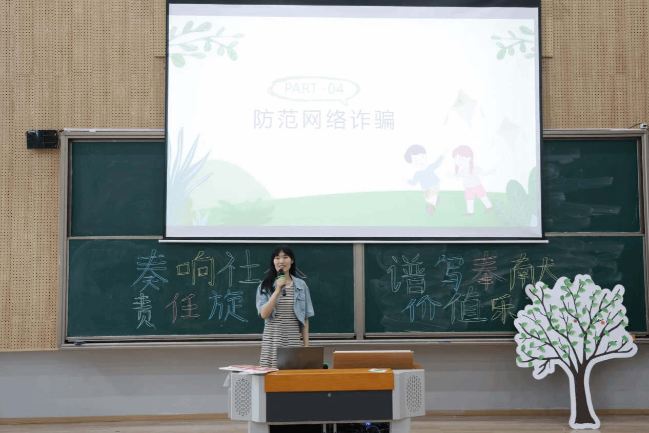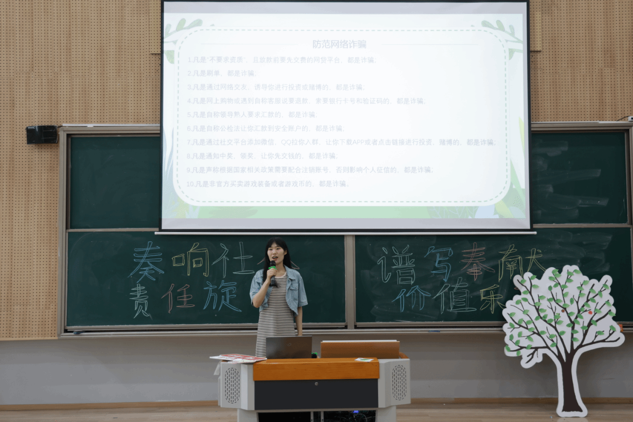 针对当前网络电信诈骗多发态势,张雪老师通过播放警示视频、剖析典型案例,揭露了刷单返利、冒充客服、虚假投资等新型诈骗手段。她提醒同学们牢记“三不一多”原则:未知链接不点击、陌生来电不轻信、个人信息不透露、转账汇款多核实。结合端午节可能出现的“低价促销”“中奖通知”等诈骗陷阱,她强调需时刻保持清醒头脑,坚决抵制诱惑。