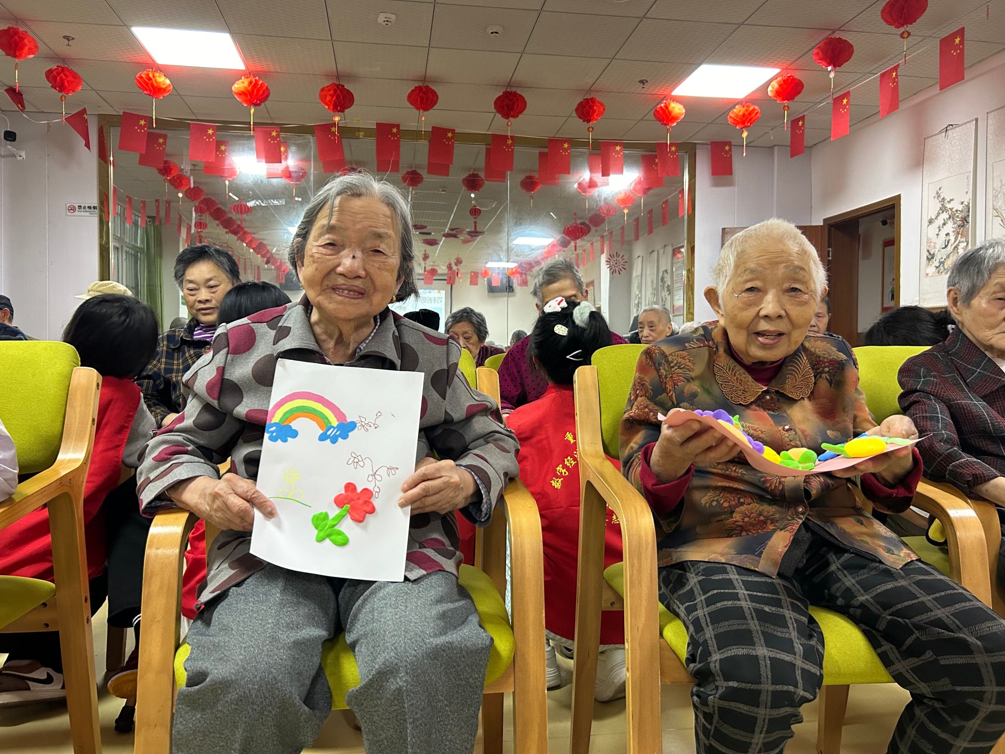 活动尾声,志愿者们协助老人整理作品,将盆栽小心摆放在窗台。老人们捧着绘画、拼贴画和手工制品,脸上洋溢着开心的笑容。此刻志愿者们通过与老人们的互动,也深刻体会到敬老爱老的意义,更加懂得了陪伴与沟通的重要性。