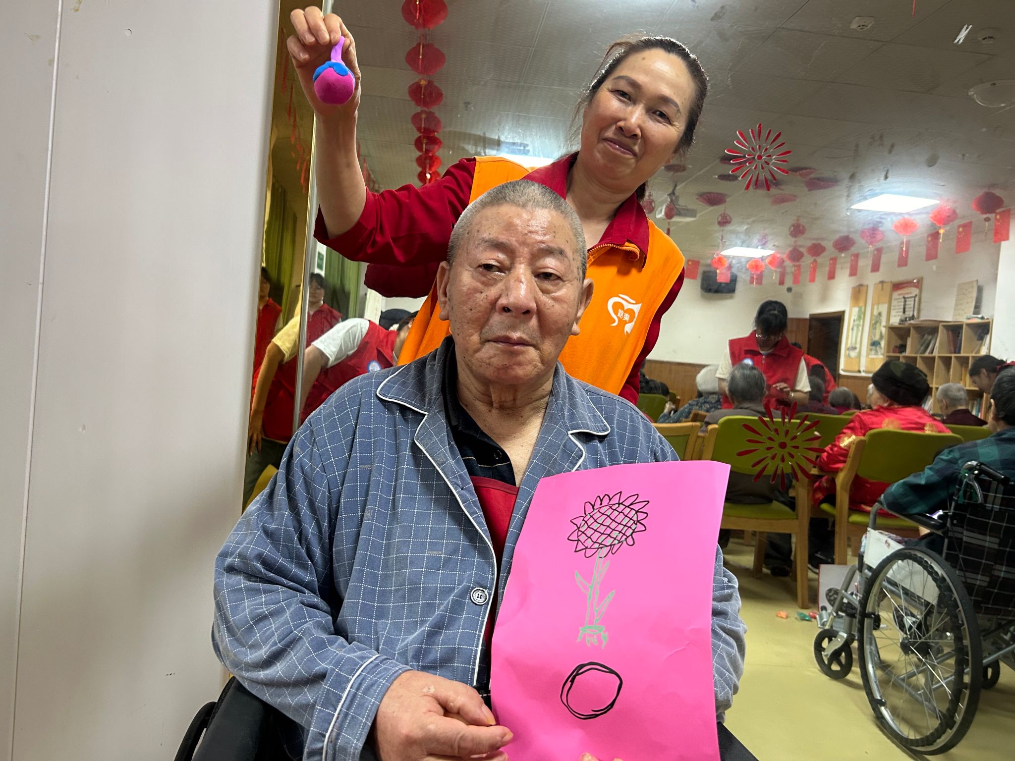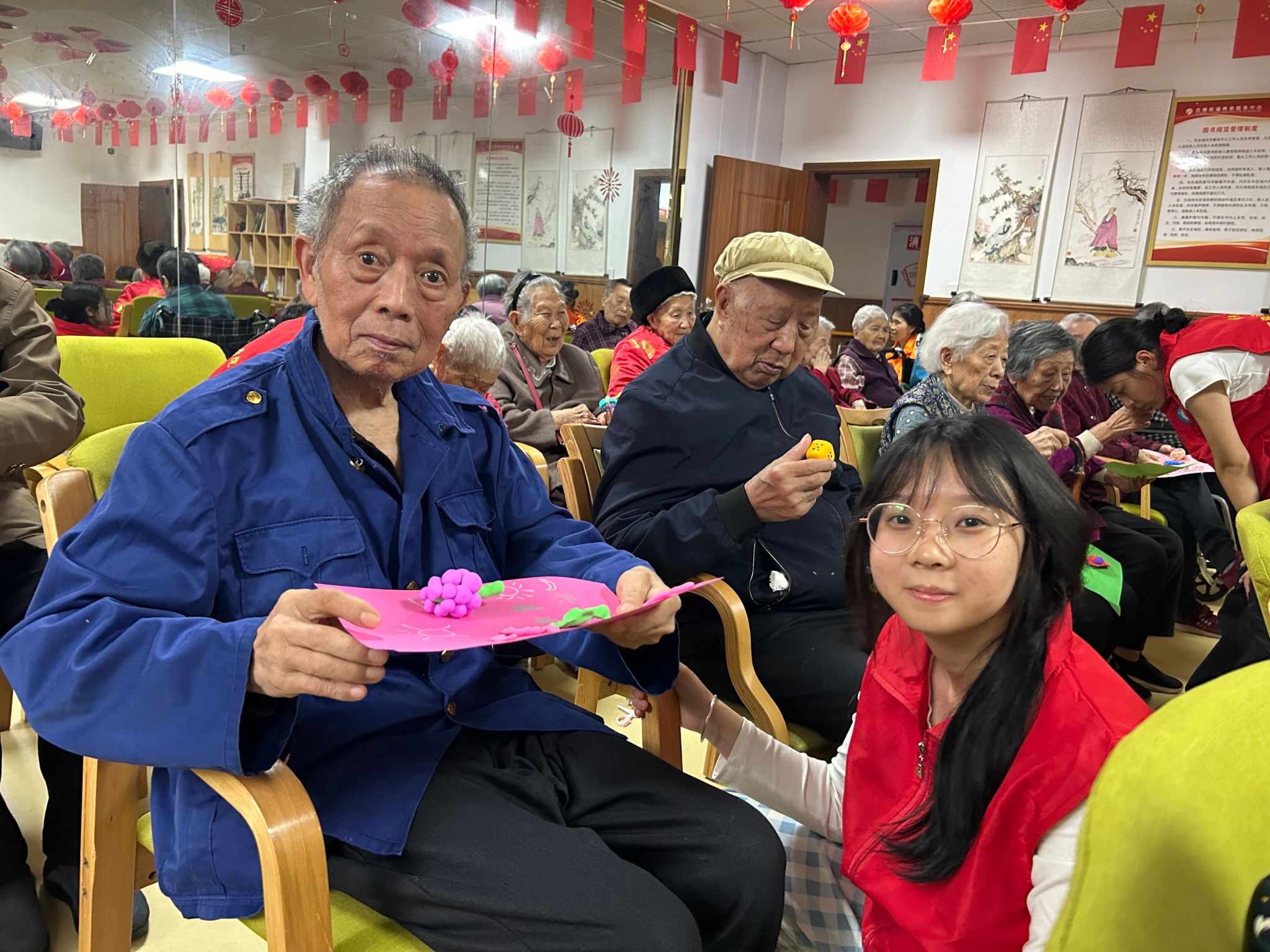 紧接着,“缤纷拼贴”和“巧手折纸花”手工活动将现场氛围推向高潮。老人们用彩色卡纸剪出各种形状,拼贴成独特的画作;志愿者们则手把手教老人们折叠纸花,并在花瓣上点缀花纹。这些活动不仅锻炼了老人们的手脑协调能力,更让他们在创作中感受到成就与快乐。