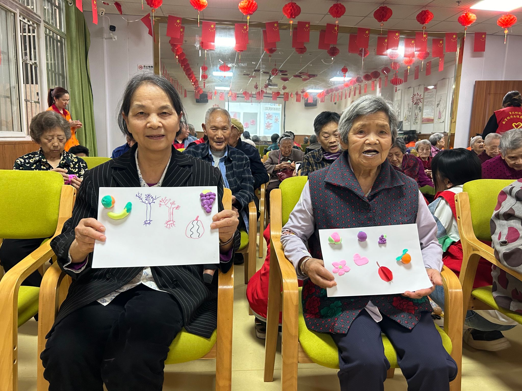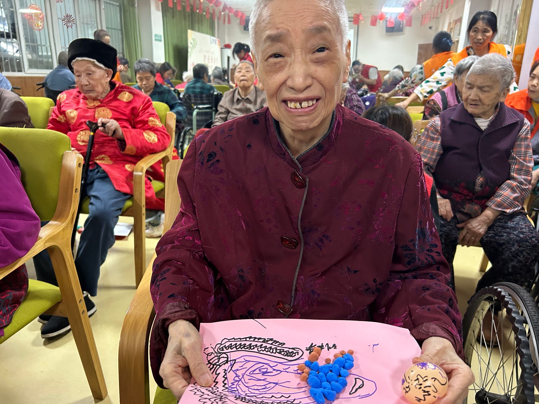 此外,结合立夏传统习俗,志愿者们还准备了彩蛋绘吉祥和轻粘土夏果制作活动。老人们用颜料在塑料蛋上绘制吉祥图案,或用彩色粘土捏出西瓜、桃子等夏季水果。这些充满趣味的手工活动,既让老人们体验到传统节气的氛围,也进一步丰富了他们的精神生活。