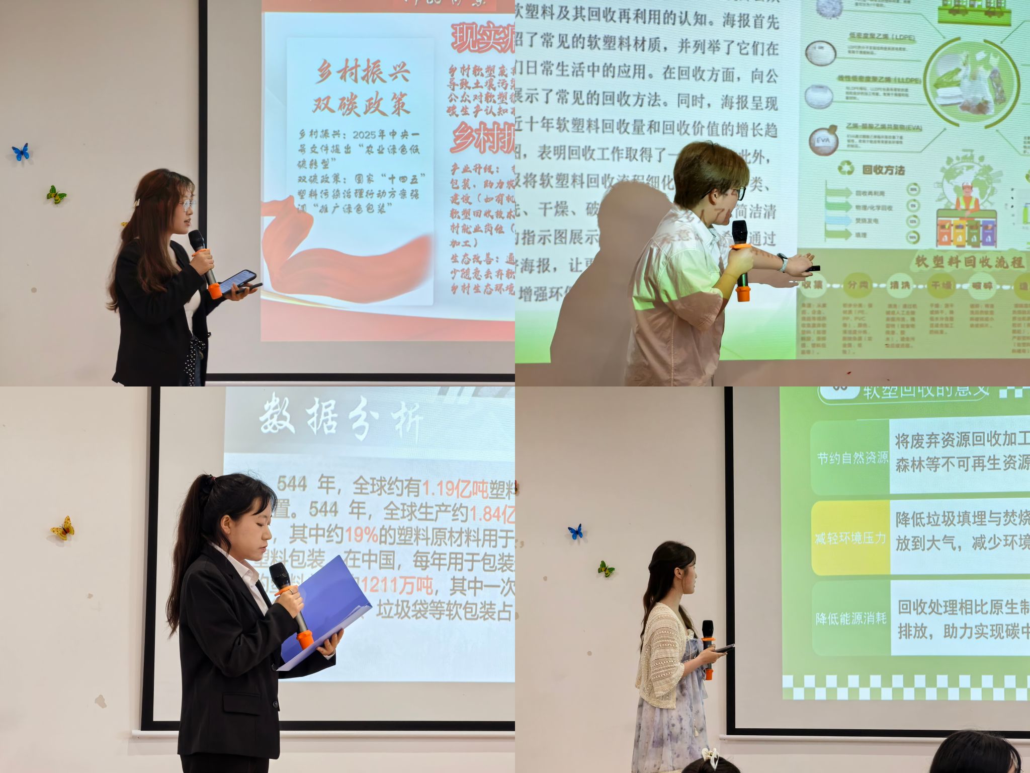 在答辩环节,各团队通过短视频、海报等形式,生动展示了软塑回收的重要性及实践方法。例如,“我说的全都队”队以海报设计传达环保理念,提出政策、科研、消费三维联动策略;“爱吃新疆炒米粉”队通过互动视频科普,结合乡村振兴与双碳政策背景,提出宣传方案;“环保新青年”队聚焦城市社区生态修复,从源头解决软塑问题。“云仔小分队”提出“互联网+”和共享驿站两种软塑回收模式。“乱七八糟队”通过视频宣传“零废弃生活”理念,介绍软塑危害、分类及处理方式。“一二三四队”通过科普海报和实地调查,构建回收利用系统。各团队的精彩表现赢得了评委和观众的认可。