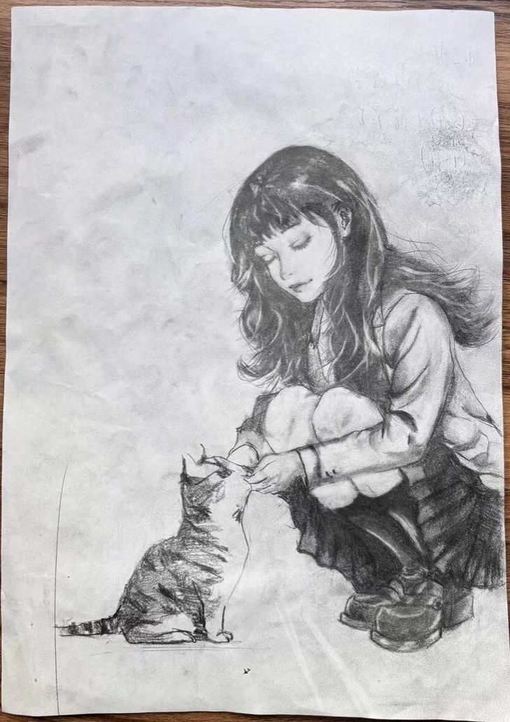 谢桐洪同学凭借其素描作品《温柔的陪伴》拔得头筹,该作品以细腻的笔触生动地描绘了女孩与小猫温馨互动的场景,在黑白线条的巧妙交错中,传递出丝丝柔情,赢得了全场最高分,荣获一等奖。
