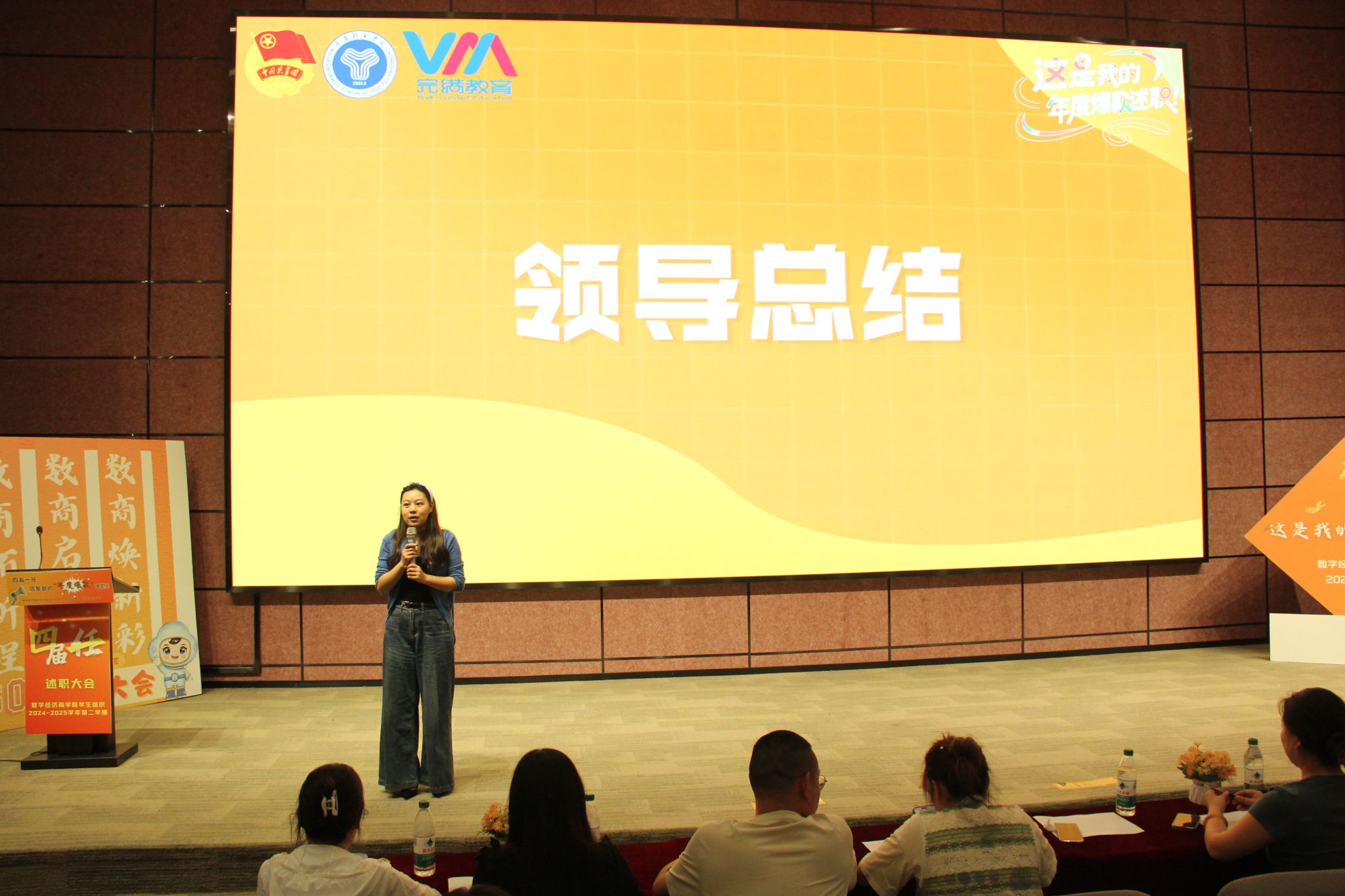 大会尾声,团总支书记潘锐老师对本次述职工作进行总结,她肯定了全体成员在过去一年的辛勤付出,强调学生工作需秉持“大我”精神,希望同学们能主动强化主人翁意识,将个人成长融入集体发展,在每一场活动中实现自我价值与团队价值的双向成长。同时,潘老师传达了学工副院长任瑞娟副教授的殷切期望,任院长对学生组织工作表示衷心感谢,希望全体成员树立远大目标,砥砺奋进;并号召大家在学院更名这一全新发展阶段,积极开拓思维,建言献策,共同绘就数字经济商学院的美好蓝图。
