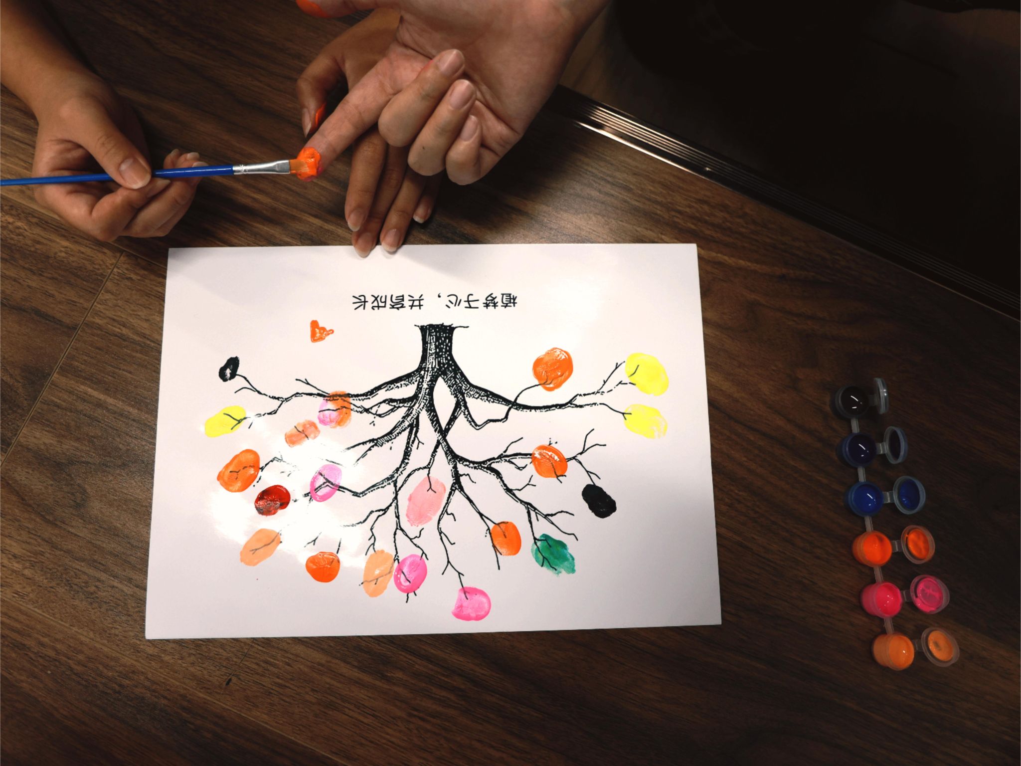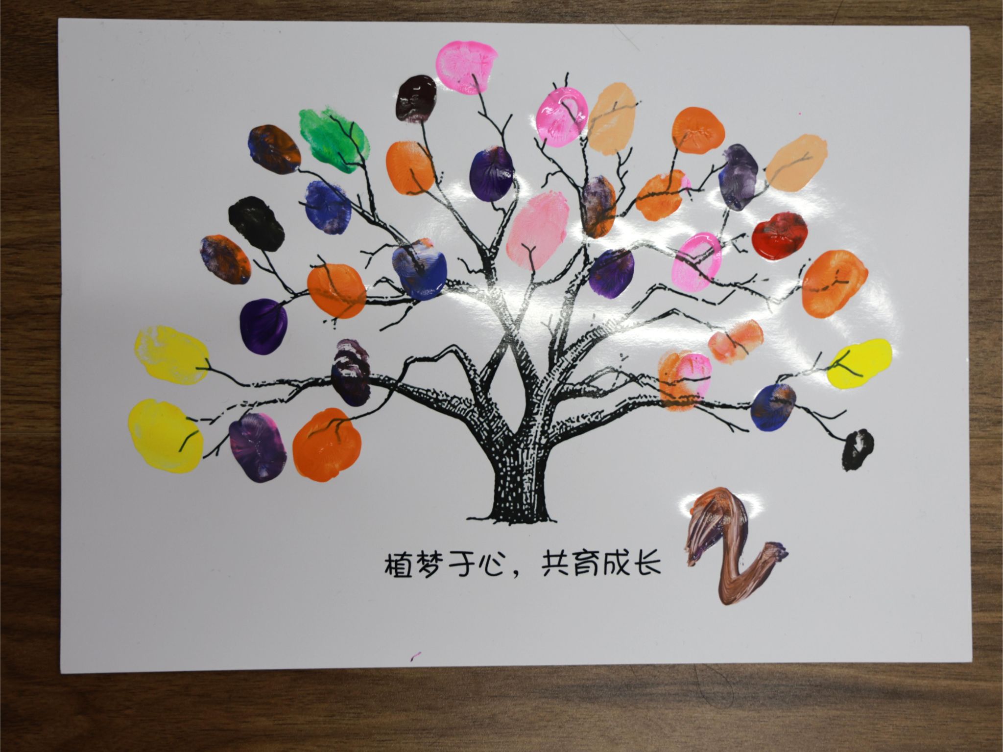 活动开始之前,每位同学在入场前都被邀请在一张特制的白纸上,用彩色印泥印下自己的手印。这一动作不仅象征着他们将留下自己的印记,成为这次心灵之旅的一部分,而且也寓意着每个人都是班级这个大家庭中不可或缺的一员。已经完成的掌印则像一朵朵盛开的花朵,围绕着树干,象征着班级的团结和每个成员的成长。树干上写着“梦想树”三个字,寓意着同学们的梦想和希望将像这棵树一样茁壮成长。