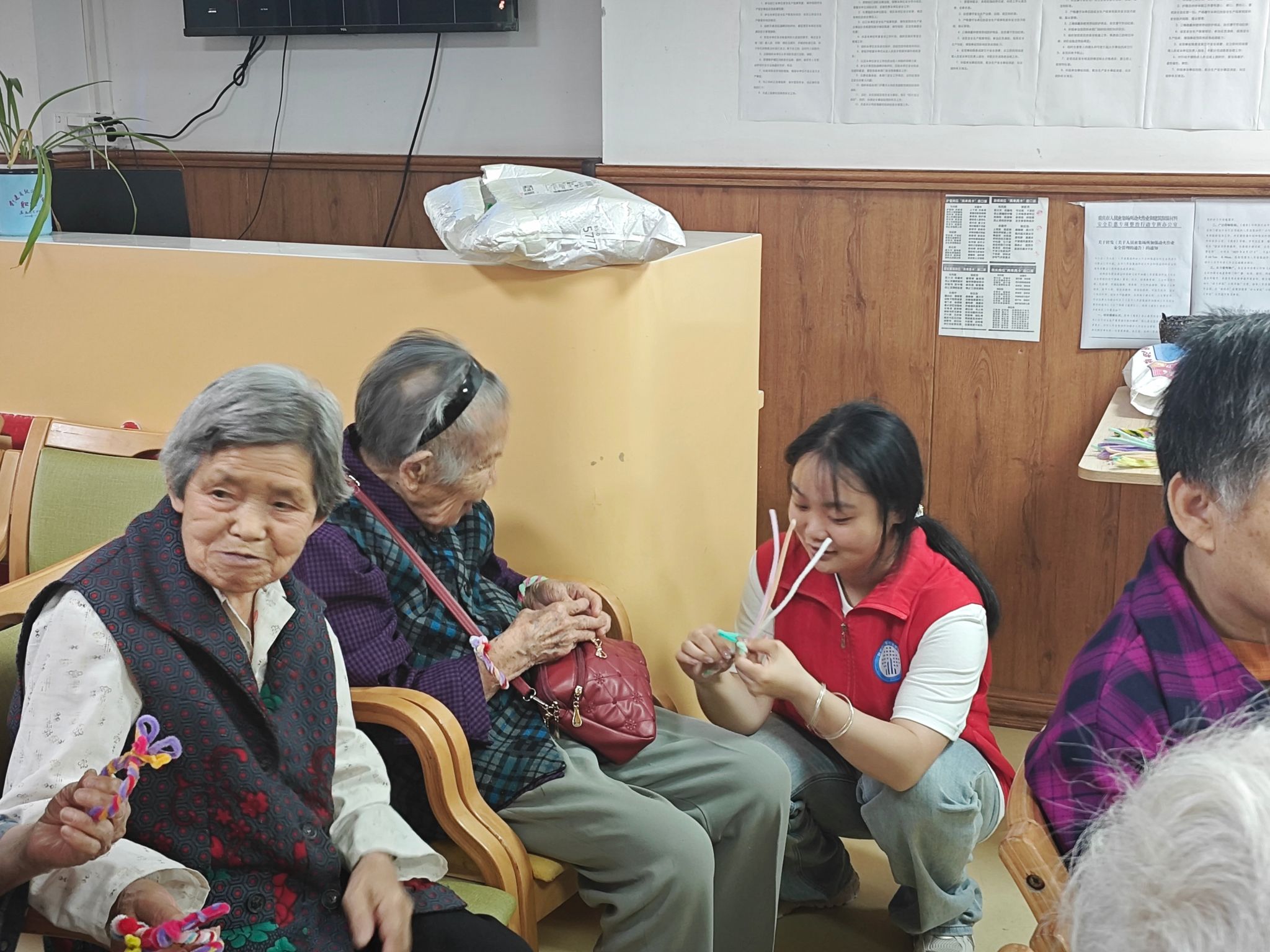 紧接着,活动进入“五彩扭扭,创意无限”环节。五彩斑斓的扭扭棒在志愿者们手中翻飞,仿佛将人们带入了一个充满创意与乐趣的手工世界。志愿者们耐心地向老人们展示如何用扭扭棒编织五彩手环和粽子形状的装饰品,这不仅是一场手工艺术的盛宴,更是一次对传统端午节习俗的创新演绎。