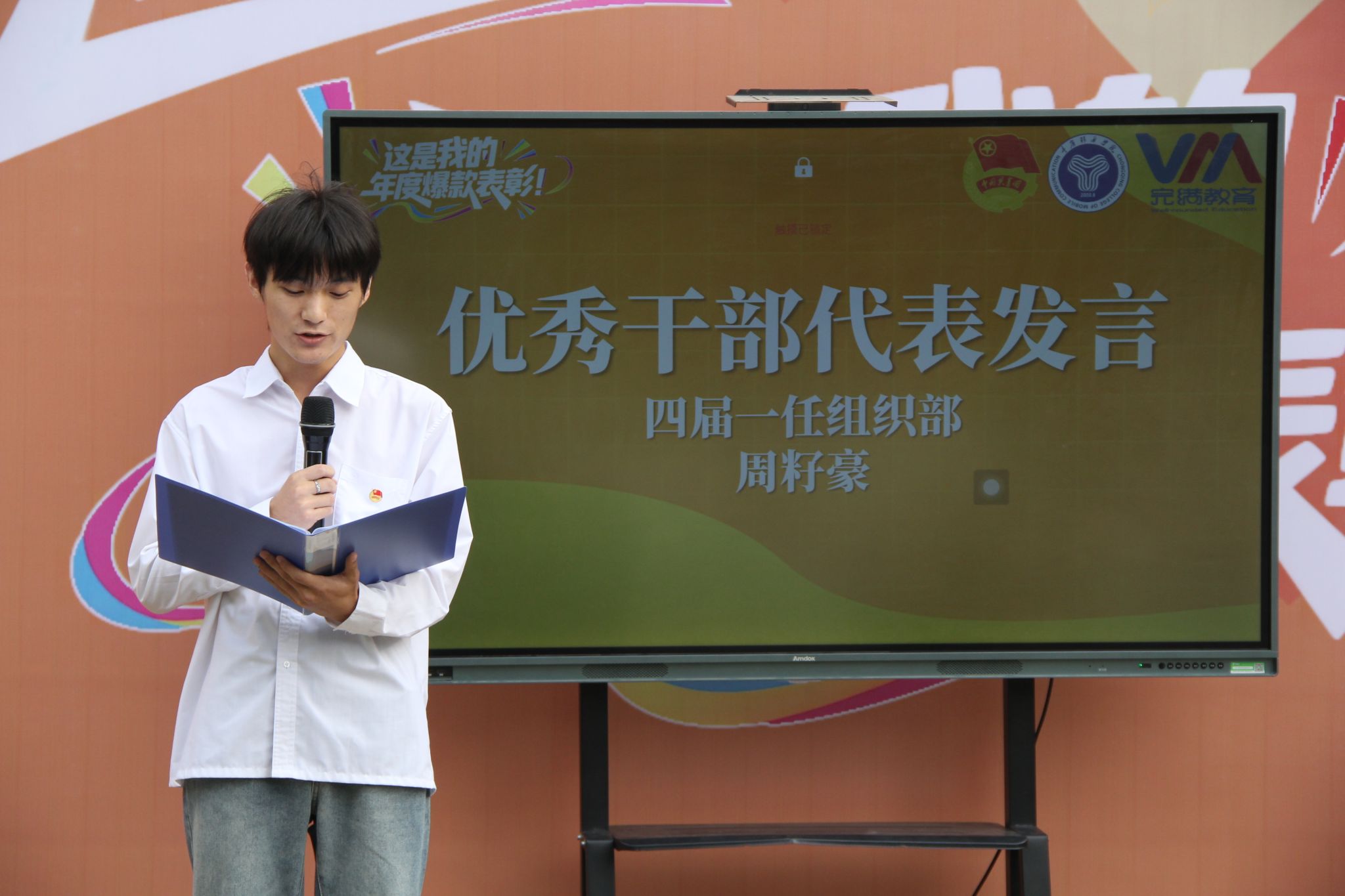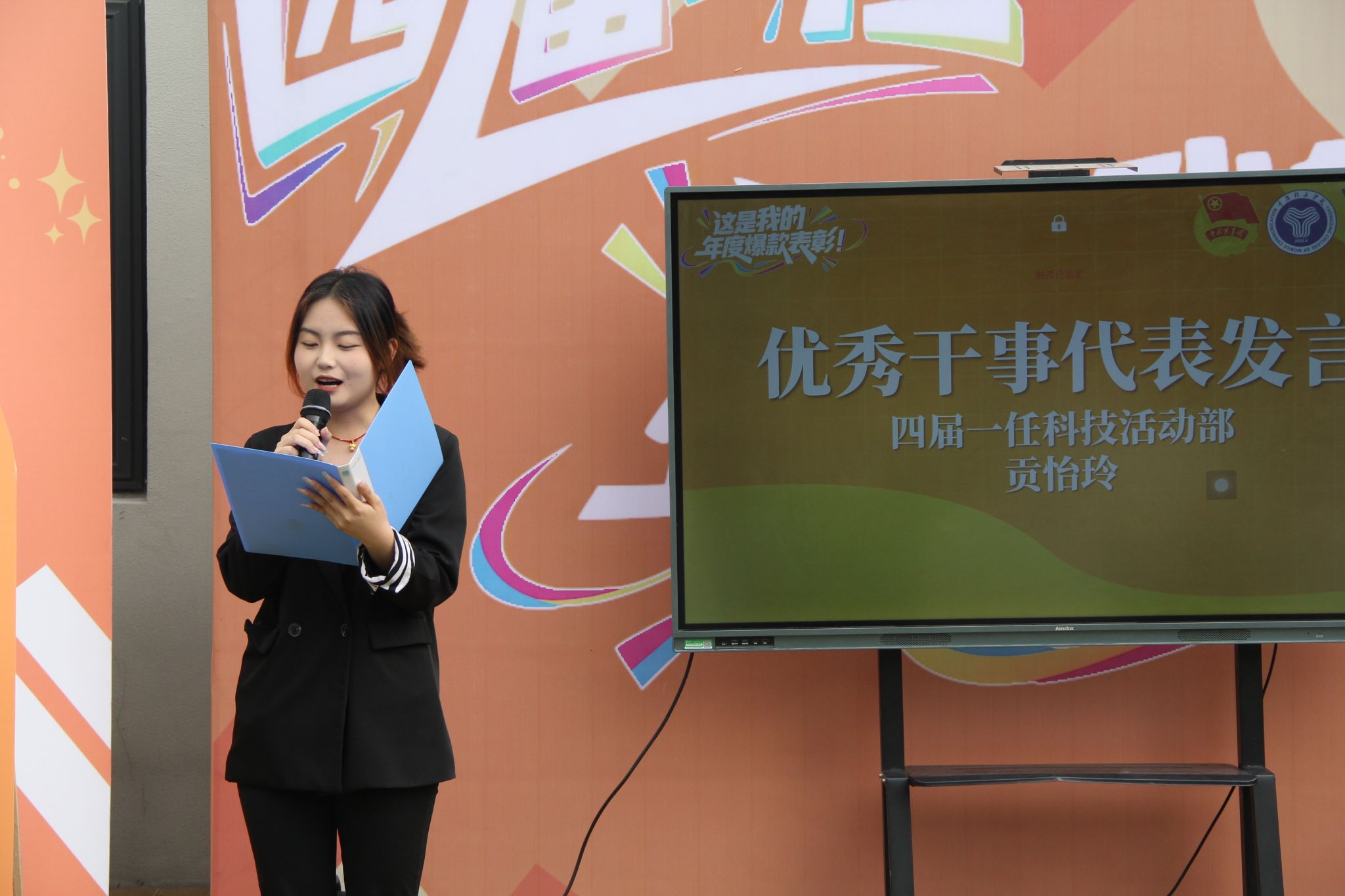 优秀干事代表、科技活动部贡怡玲同学分享了她的蜕变历程。她坦言,最初以为干事工作就是“听安排、跑流程”,但实践让她明白,真正的干事需要主动思考“同学需要什么”“能不能做得更好”。这一年,她不仅锻炼了组织协调能力,更在团队合作与服务同学中收获了珍贵的友谊与感动。她引用诗句“纸上得来终觉浅,绝知此事要躬行”,并生动地比喻自己像一颗“小小的螺丝钉”,在学生会这个大机器里找到了属于自己的齿轮,和大家一起把“想做的事”变成了“做成的事”。