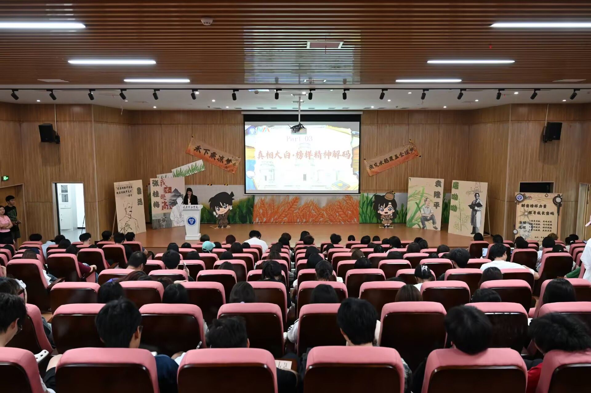 经过层层闯关与思维碰撞,所有参与者顺利回到主会场,大屏幕播放着精心制作的榜样人物专题短片,通过生动的画面与深情旁白,系统呈现了榜样人物袁隆平先生的成长历程与其精神风貌。