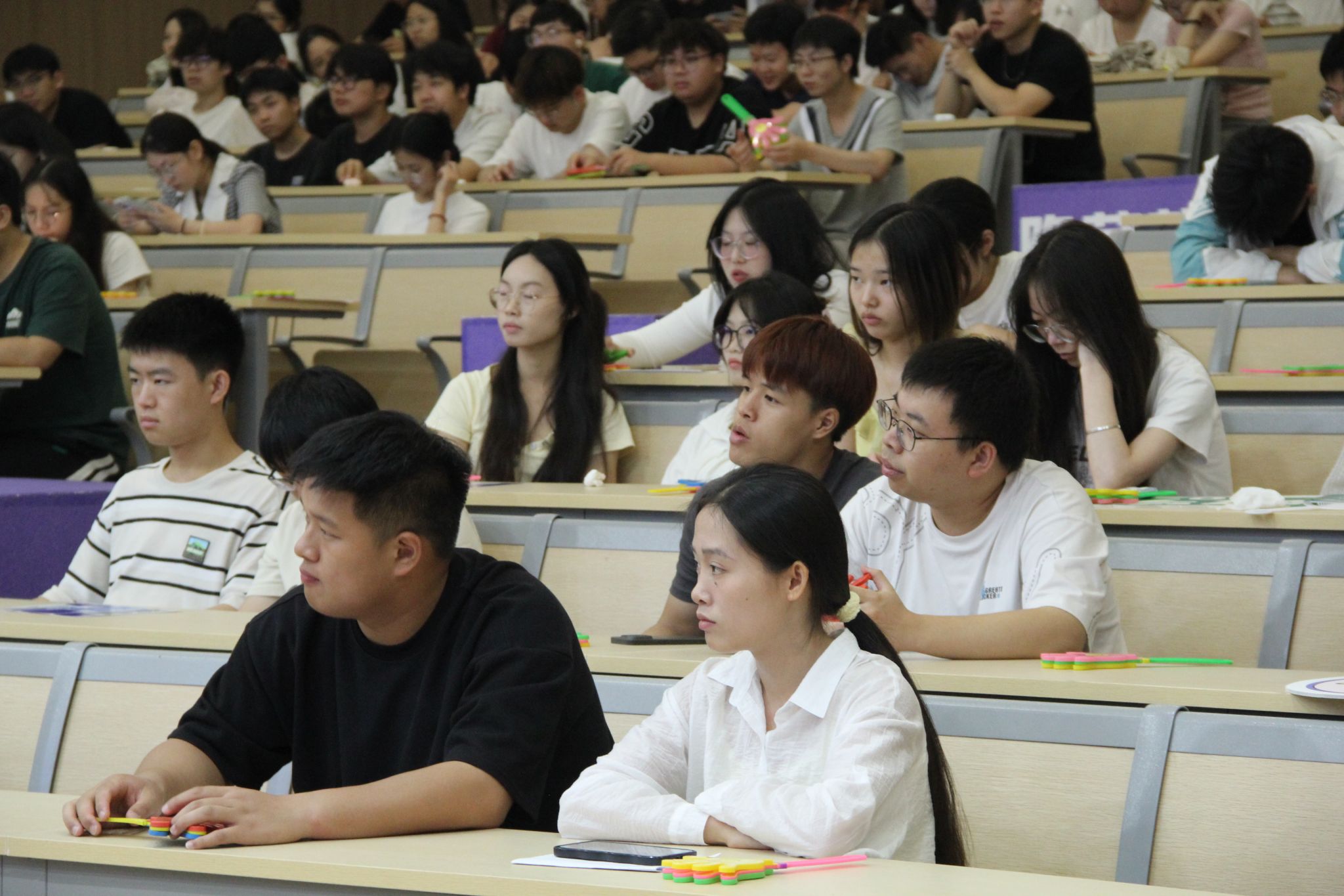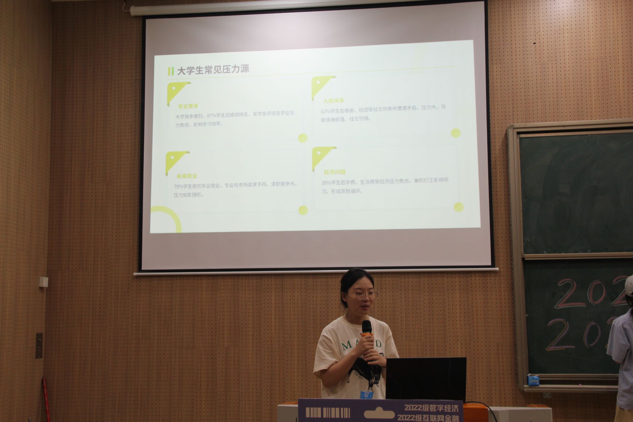 接着,一组数据揭示了当代大学生的压力现状:87%的学生因学业竞争感到焦虑,62%的学生在社交中遭遇人际关系矛盾,79%的学生为未来就业担忧,35%的学生受经济压力困扰。这些真实的压力源引起了在场学生的强烈共鸣,很多人在互动环节分享了自己在成绩排名、社团矛盾以及兼职与学习平衡等方面的困惑。