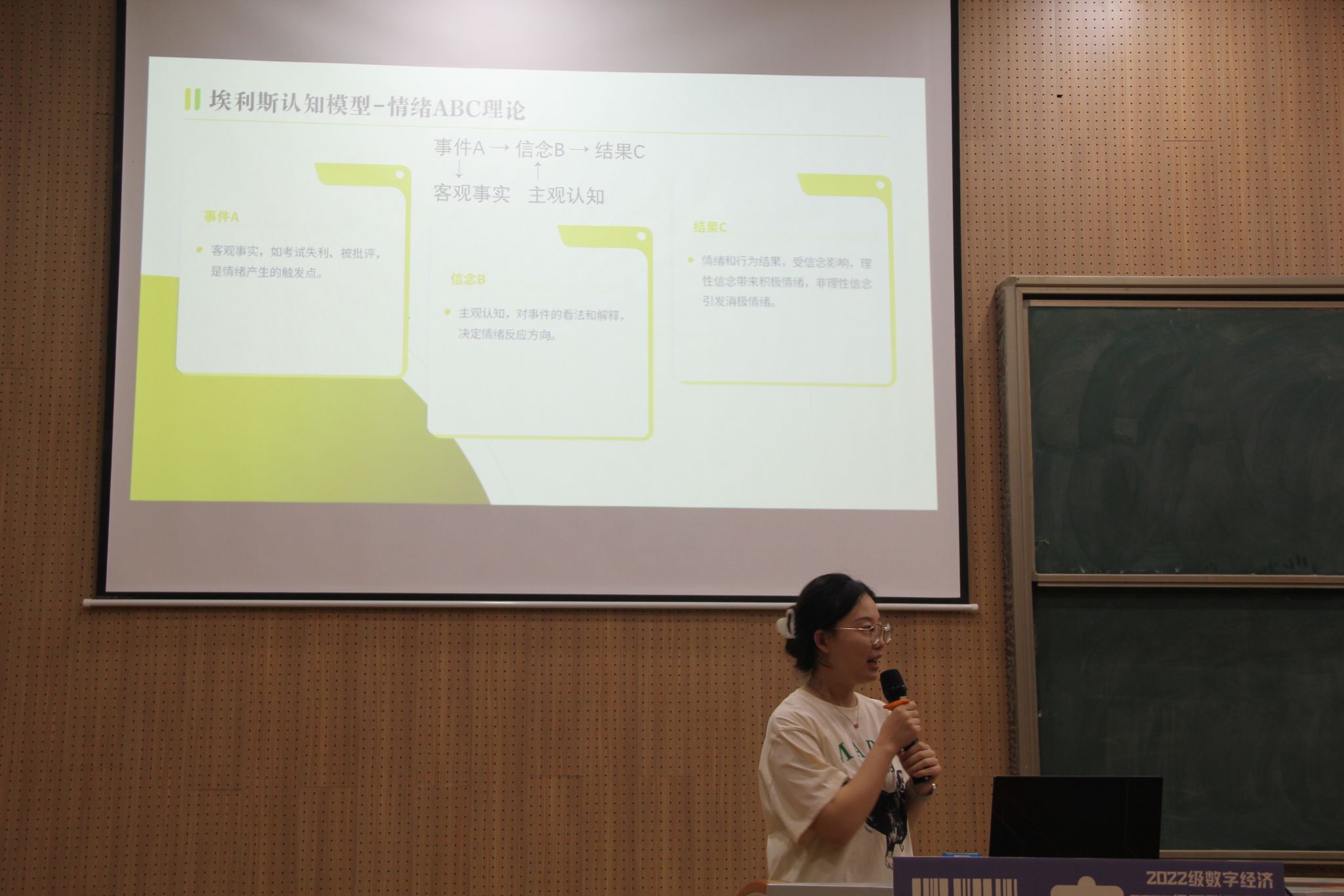 针对压力管理,田老师引入了埃利斯认知模型“情绪ABC理论”,通过“考试失利”的正反案例对比,阐述了客观事件(A)、主观认知(B)和情绪结果(C)之间的联系。田老师强调,像“我彻底完了”这样的非理性信念会导致消极情绪,而“这次失败说明需要调整学习方法”这样的理性替代思维则能引导积极行动。