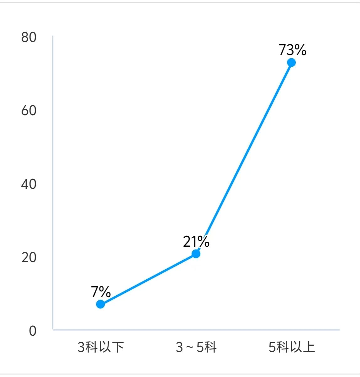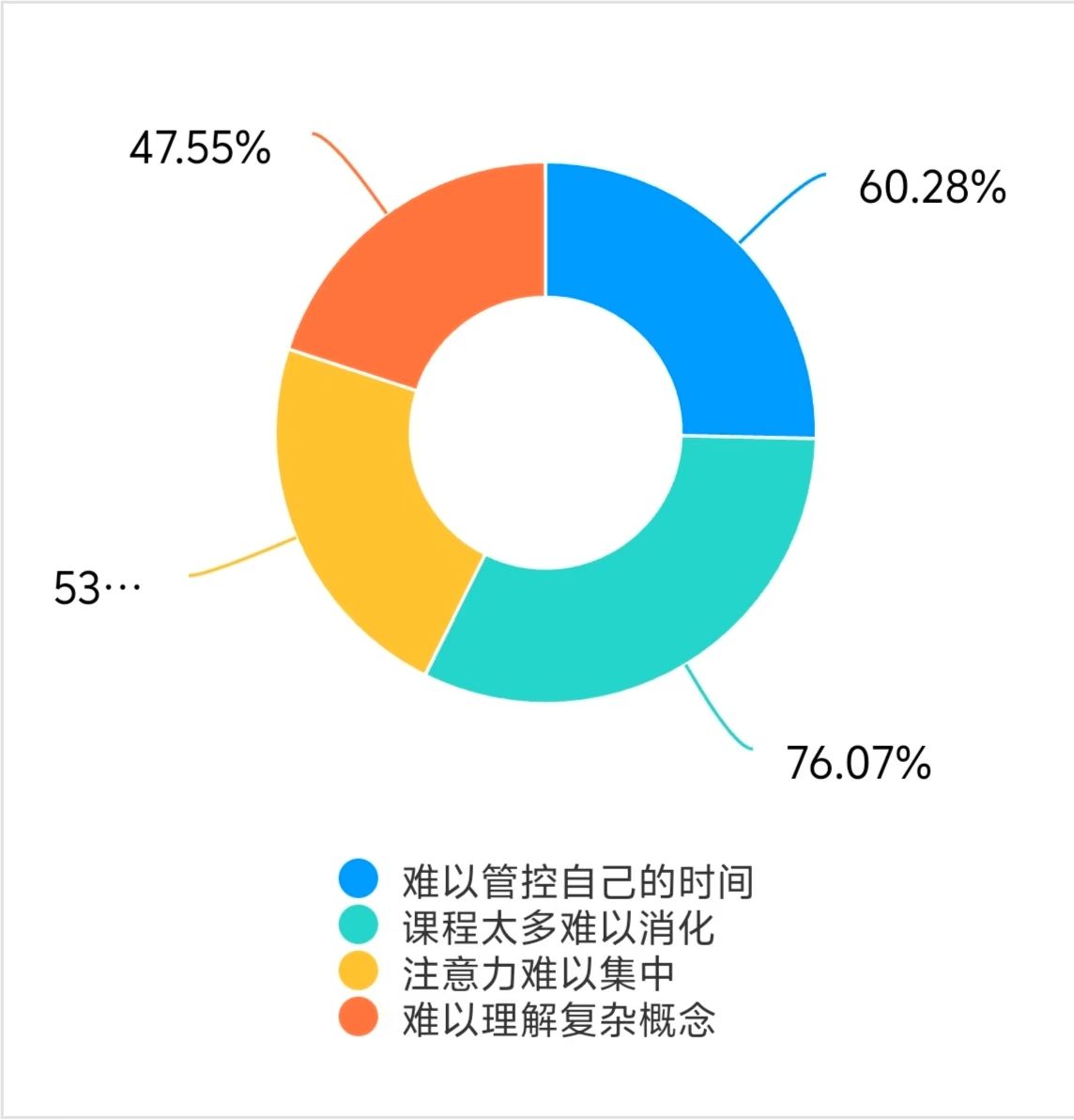 72.7%学生单学期复习科目≥5科,超过绝大部分同学预期承载量,76.07%学生认为"课程太多难以消化"是首要障碍,印证"知识过载"现象普遍存在。