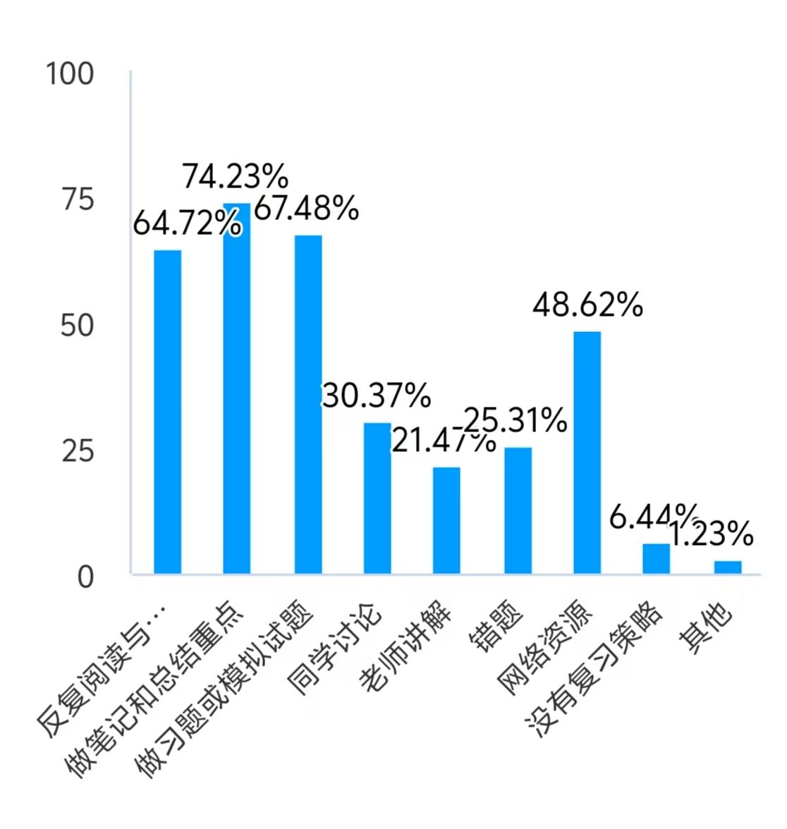 64.72%依赖"反复阅读",74.23%采用"笔记整理",但仅有42.48%自评复习效果"较好"。60.28%学生承认存在"时间管理失当",暴露学习方法论缺失。