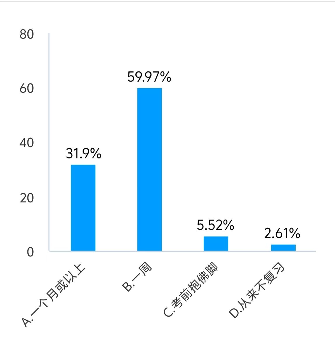 59.97%学生选择考前一周启动复习,31.9%提前一月规划,"突击型"复习占比超六成,仅8.44%学生能保证全天候复习,39.26%日均投入不足3小时。