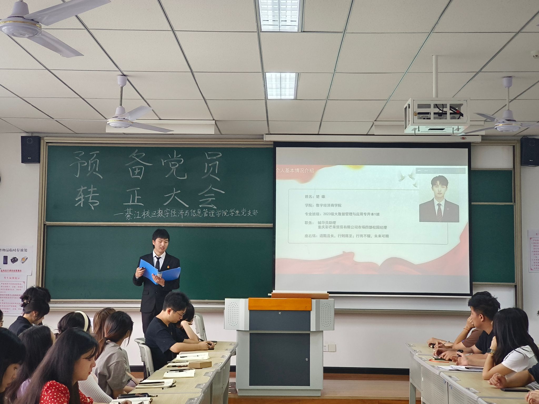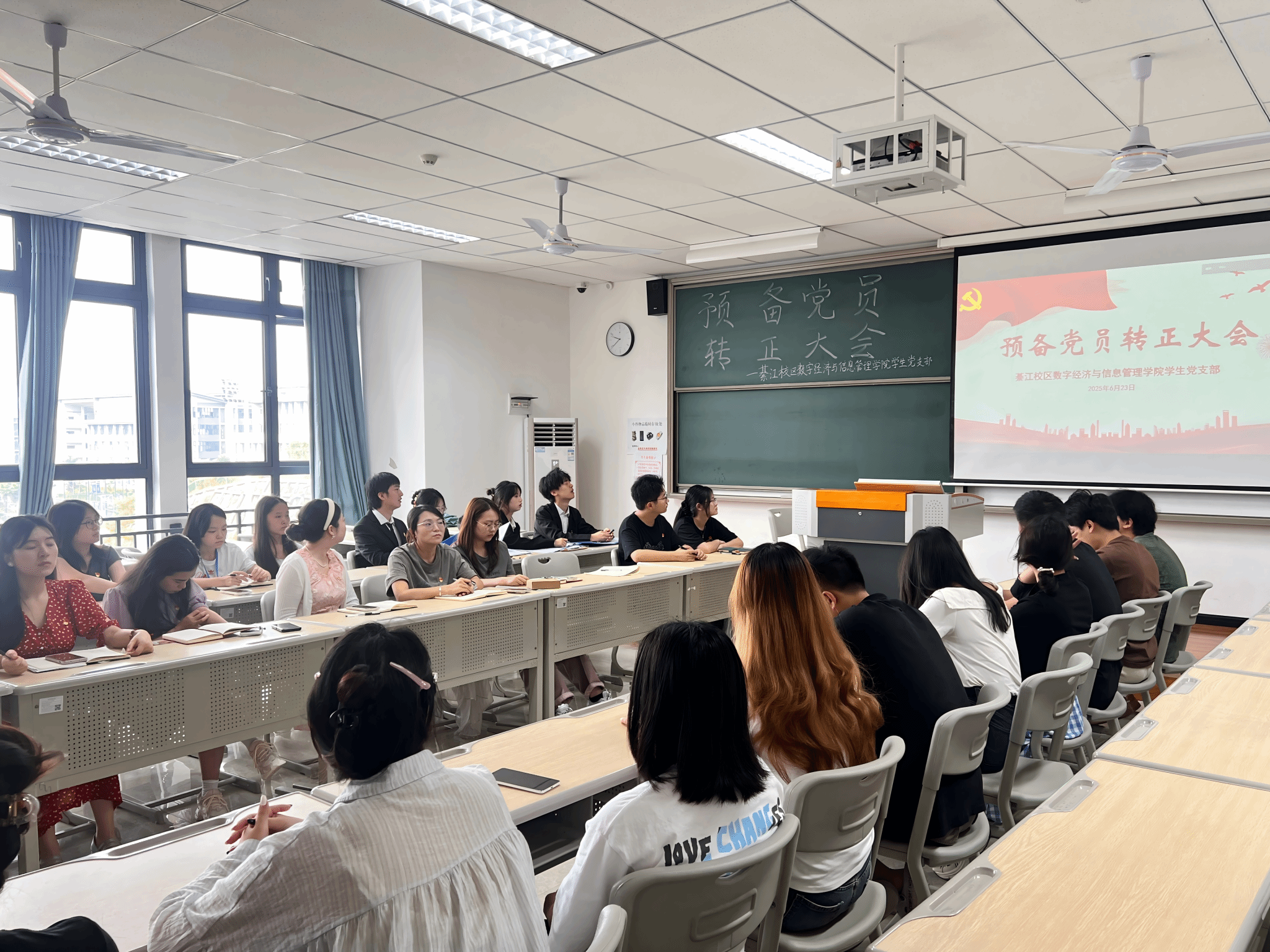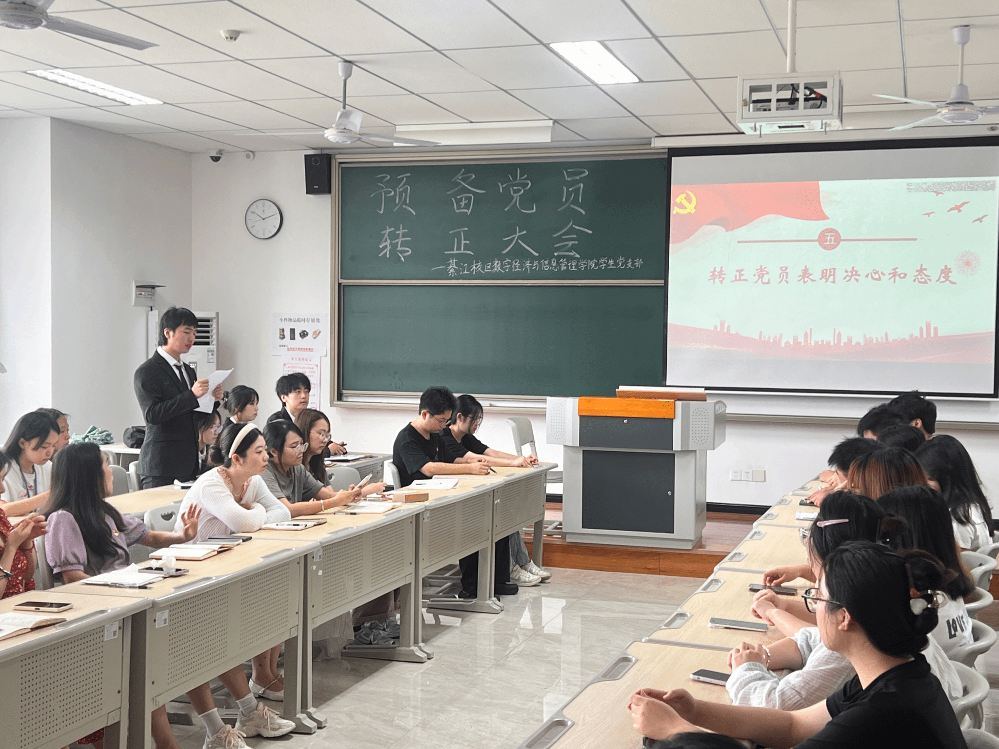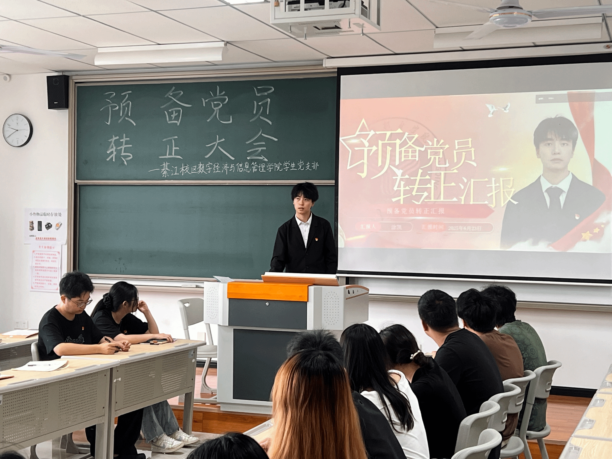 为进一步加强党员队伍建设,巩固和扩大党的队伍,增强党员队伍的生机与活力,严把党员发展“入口关”,切实提升党员发展工作的科学化、规范化水平,2025年6月23日上午9:30,綦江校区数字经济与信息管理学院学生党支部在仁者楼501教室召开预备党员转正会议,审议涂凯、楚雄、袁珠烨、王雨馨四位同志转正事宜。会议采用“线上+线下”同步模式,由党支部书记任超群主持,全体党员同志参会。