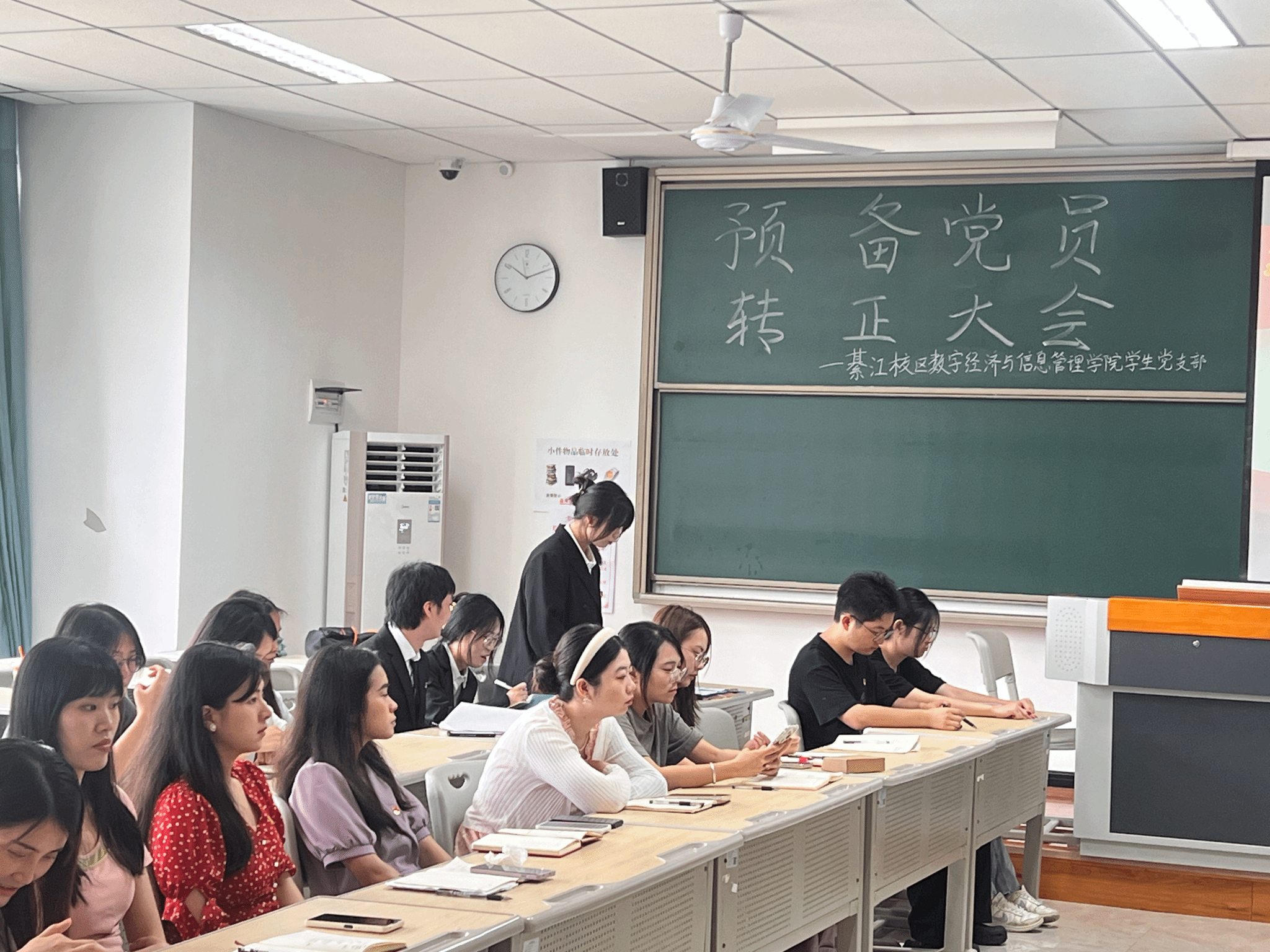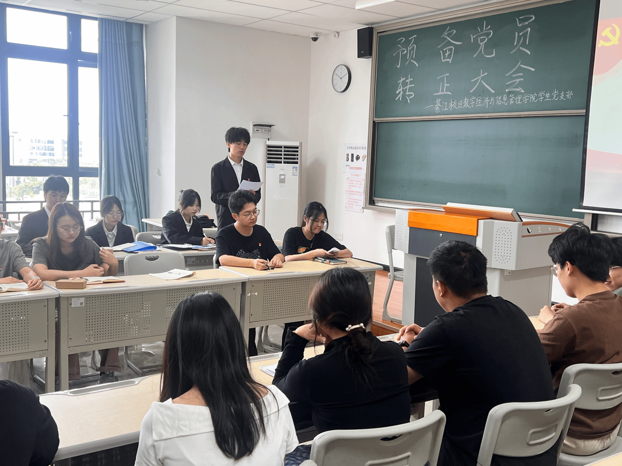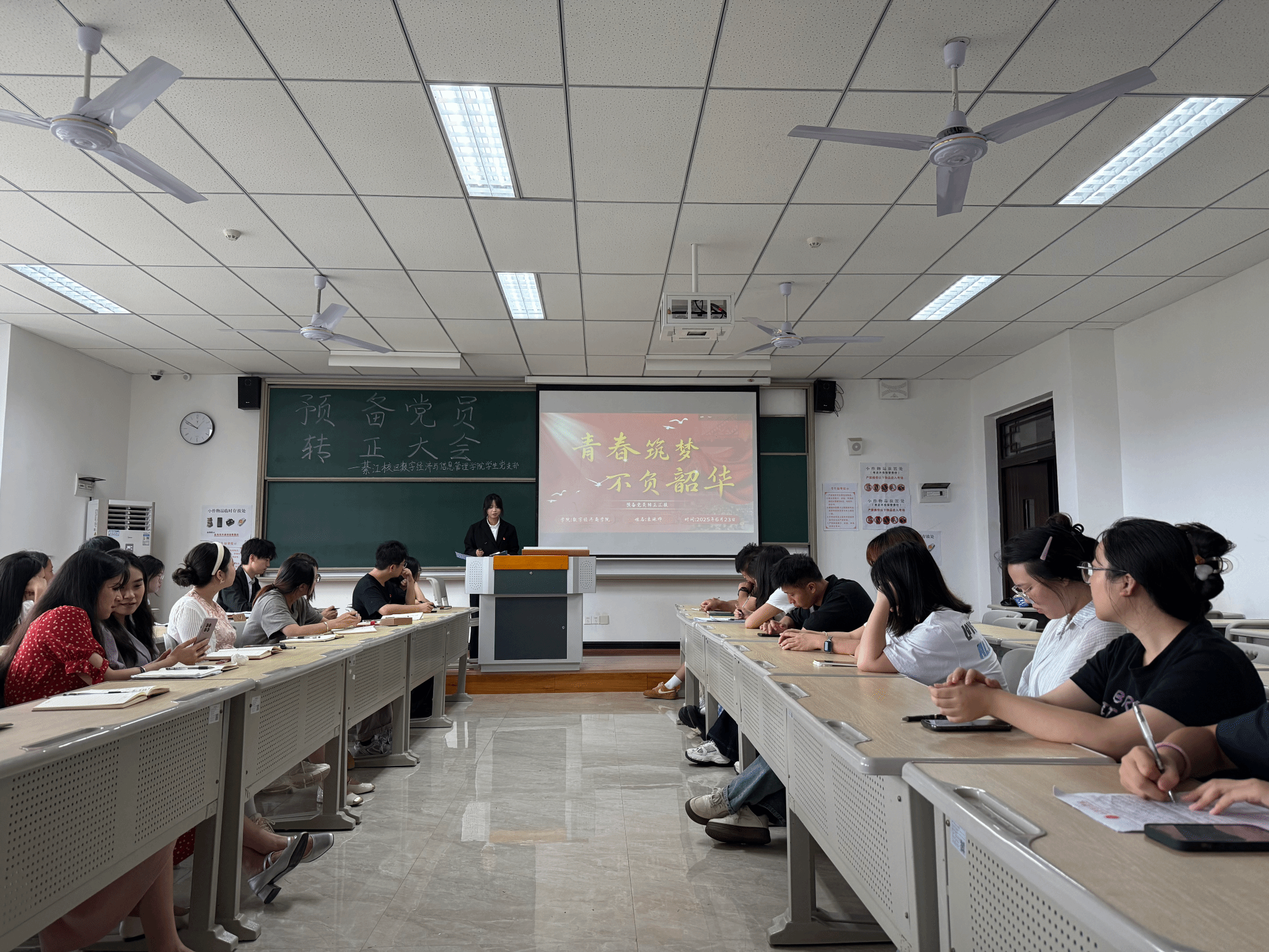 为进一步加强党员队伍建设,巩固和扩大党的队伍,增强党员队伍的生机与活力,严把党员发展“入口关”,切实提升党员发展工作的科学化、规范化水平,2025年6月23日上午9:30,綦江校区数字经济与信息管理学院学生党支部在仁者楼501教室召开预备党员转正会议,审议涂凯、楚雄、袁珠烨、王雨馨四位同志转正事宜。会议采用“线上+线下”同步模式,由党支部书记任超群主持,全体党员同志参会。
