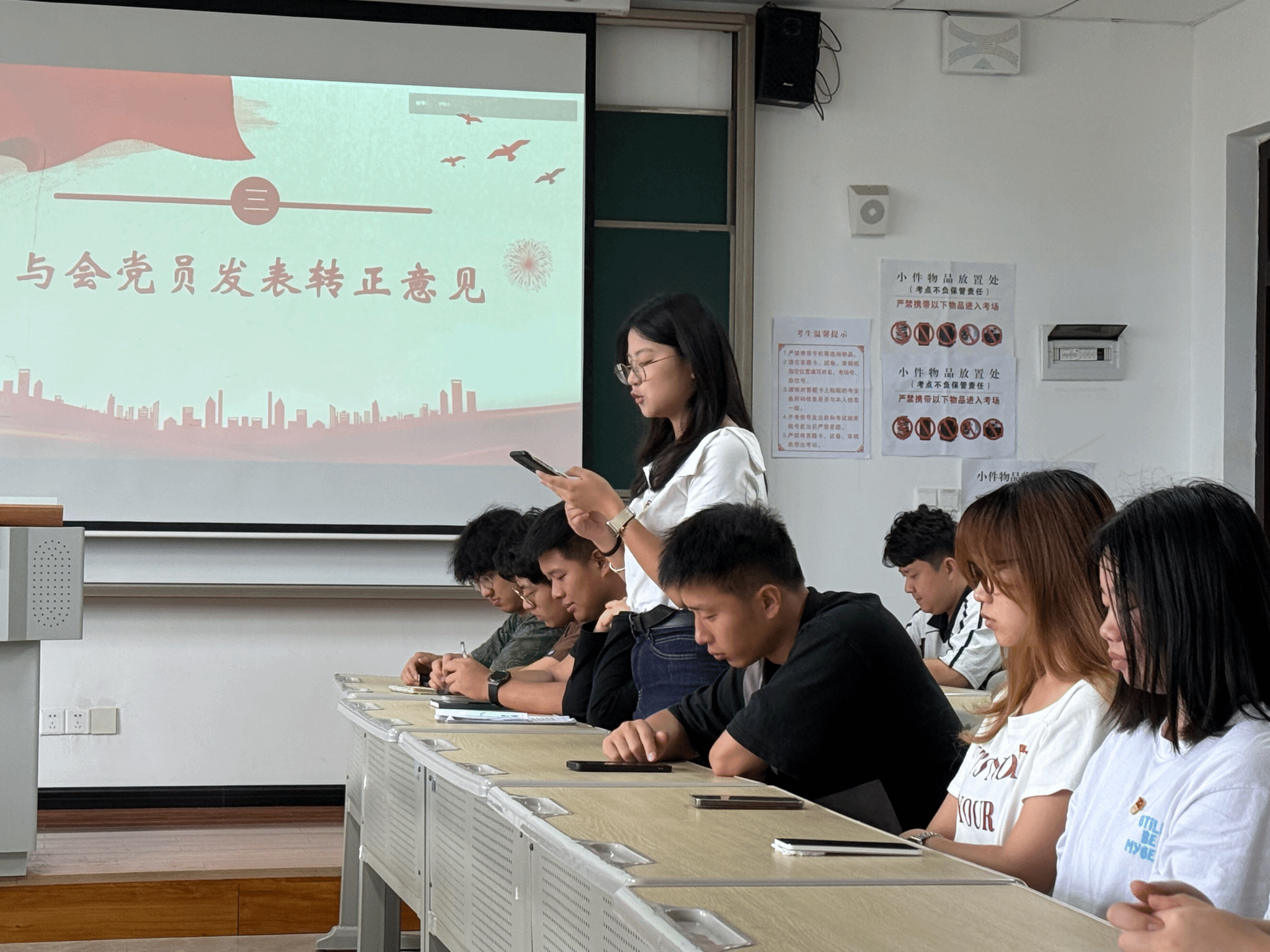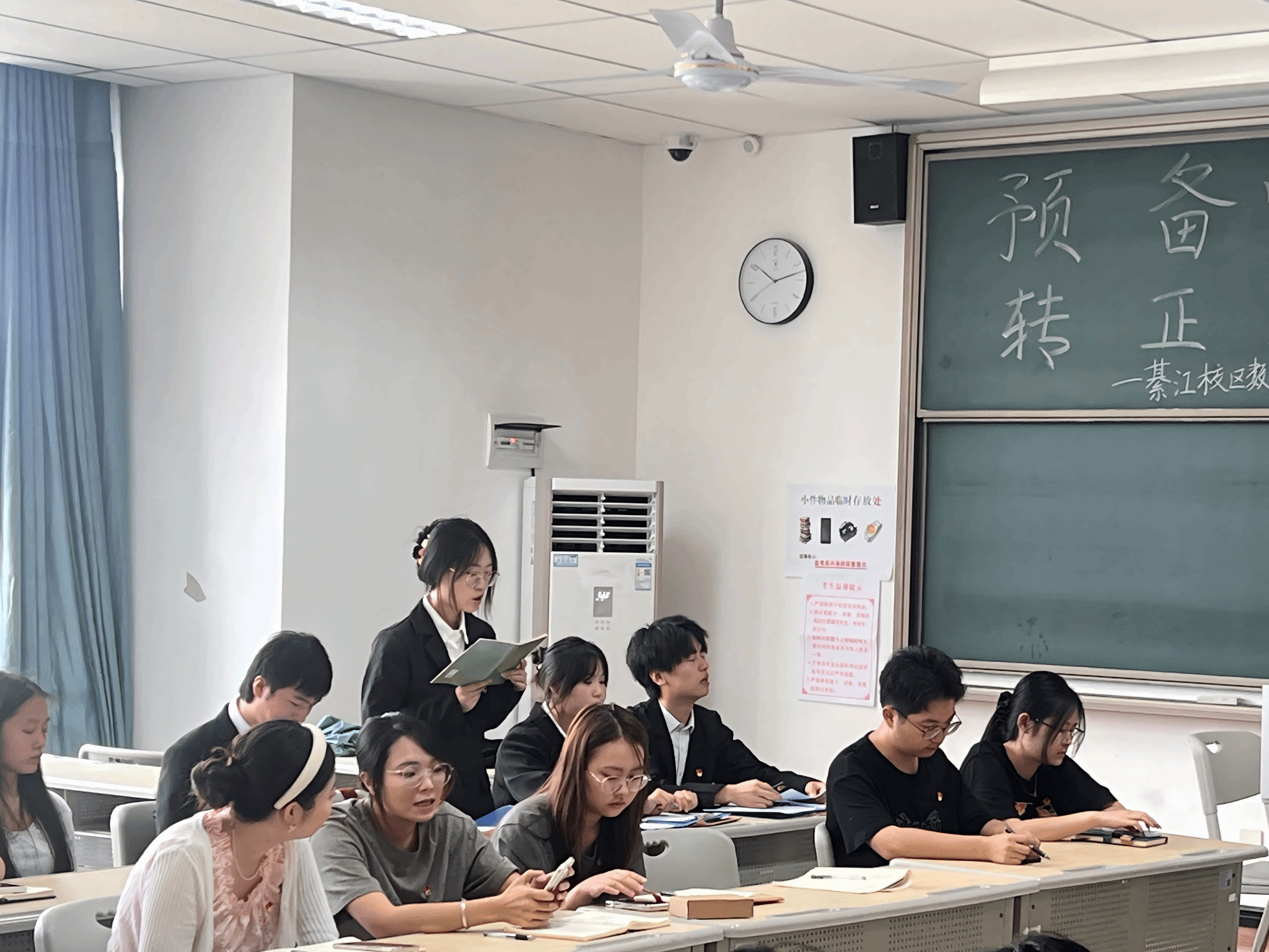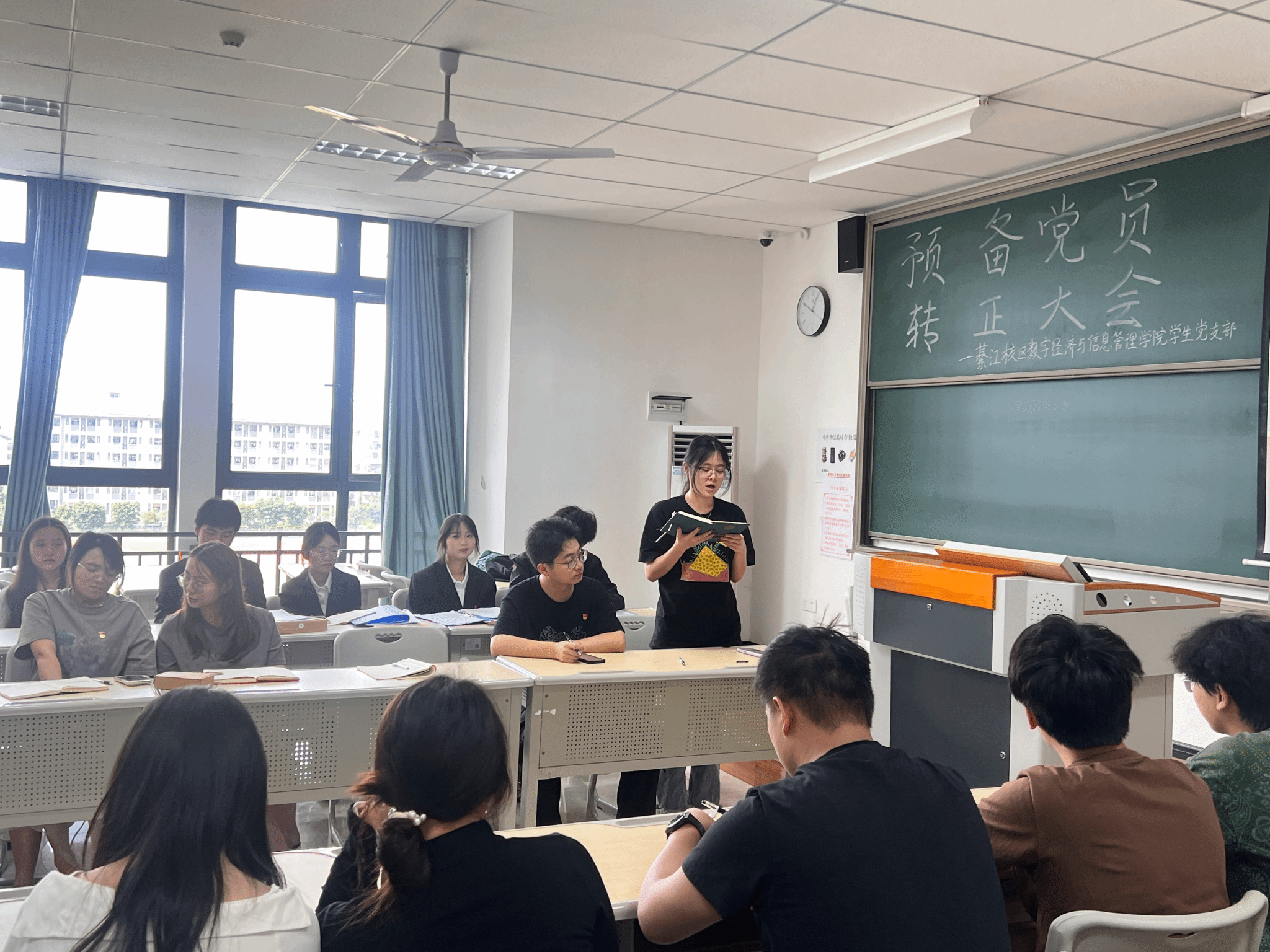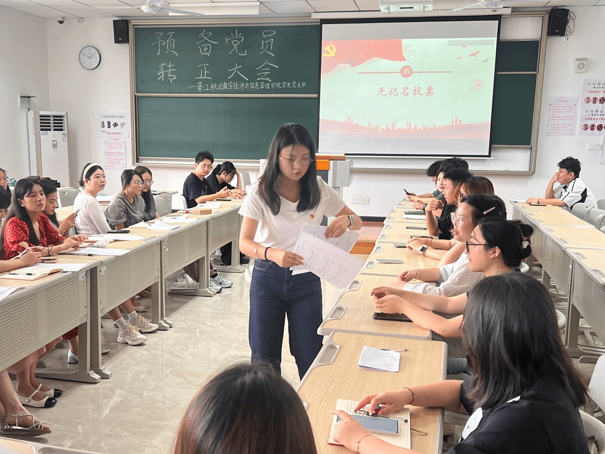 为进一步加强党员队伍建设,巩固和扩大党的队伍,增强党员队伍的生机与活力,严把党员发展“入口关”,切实提升党员发展工作的科学化、规范化水平,2025年6月23日上午9:30,綦江校区数字经济与信息管理学院学生党支部在仁者楼501教室召开预备党员转正会议,审议涂凯、楚雄、袁珠烨、王雨馨四位同志转正事宜。会议采用“线上+线下”同步模式,由党支部书记任超群主持,全体党员同志参会。