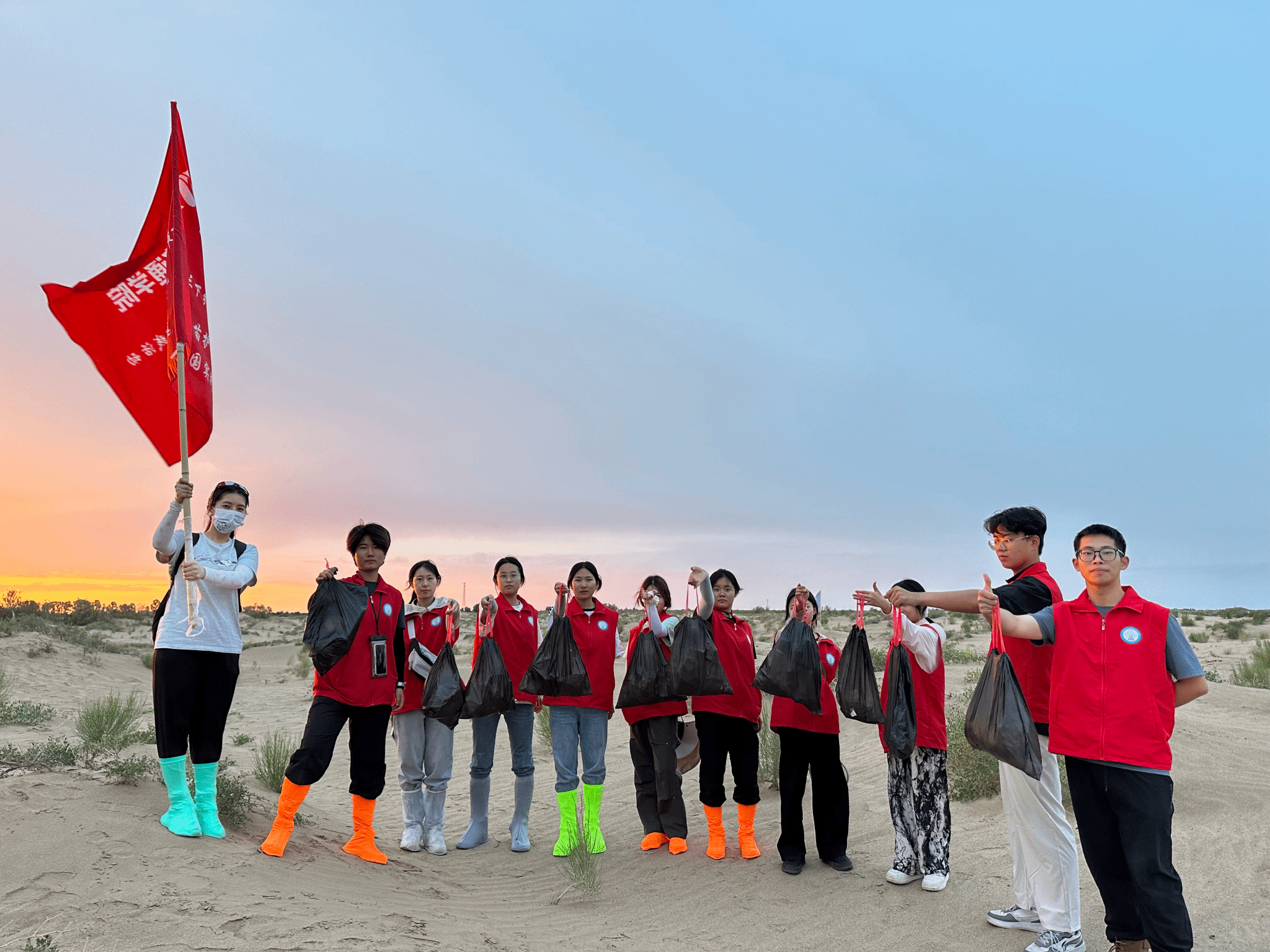 当最后一缕暑气随着夕阳沉入沙海,兴隆村被温柔的暮色悄然笼罩。实践团成员们匆匆结束晚餐,便拿起垃圾袋、铁锹等工具,踩着沙粒铺就的村道,开启了守护生态的志愿行动。村道两旁,梭梭苗在晚风里轻轻摇曳,却藏不住散落其中的塑料瓶、包装袋。队员们俯身钻进沙柳丛,指尖小心翼翼地拨开枝叶,将藏匿其中的垃圾逐一拾起;面对被风沙掩埋半截的废弃物品,两人一组相互配合,一人稳住物件,一人用铁锹慢慢刨挖。实践团成员纷纷表示“这片土地生态本就脆弱,我们多清理一点垃圾,就能少一分污染。”劳作间隙,众人望向远处,广袤沙海之上,浑圆的落日如燃烧的火球,缓缓坠入地平线。漫天金色晚霞似打翻的颜料,将连绵沙丘染成瑰丽的琥珀色,余晖倾洒在忙碌的队员身上,为年轻的身影镀上一层温暖光晕。他们弯腰捡拾垃圾的姿态,与壮丽的沙漠落日融为一体,绘就了一幅人与自然和谐共生的动人画卷。