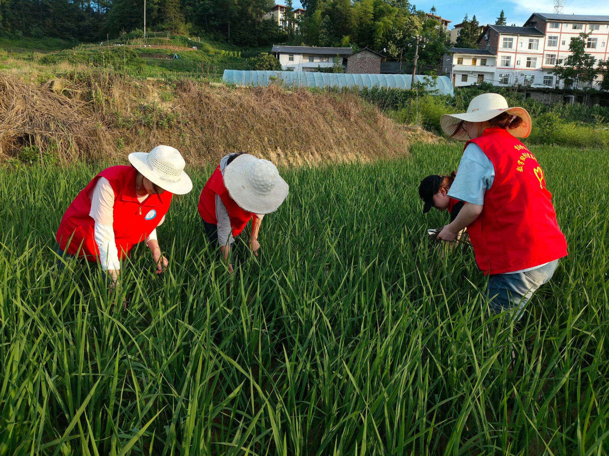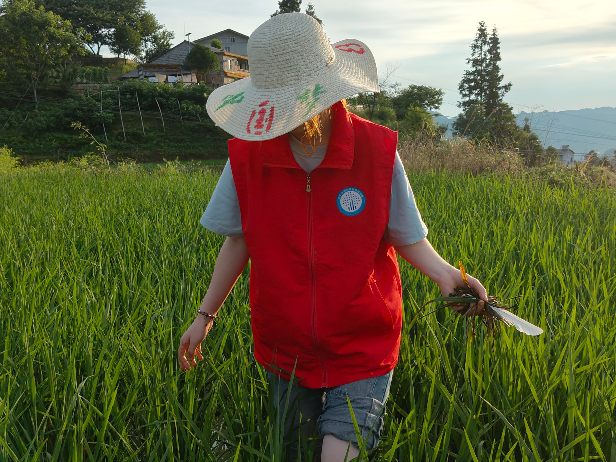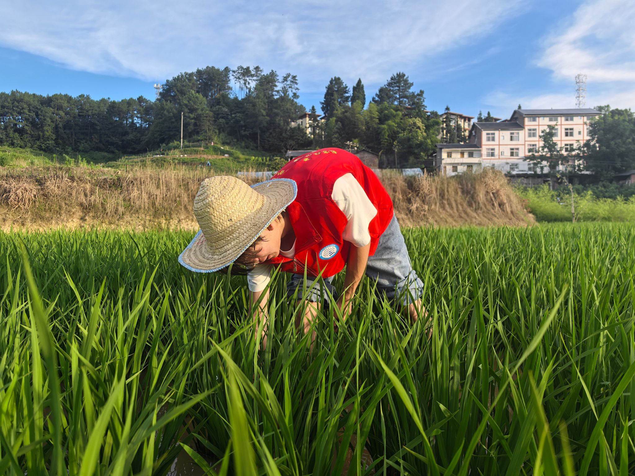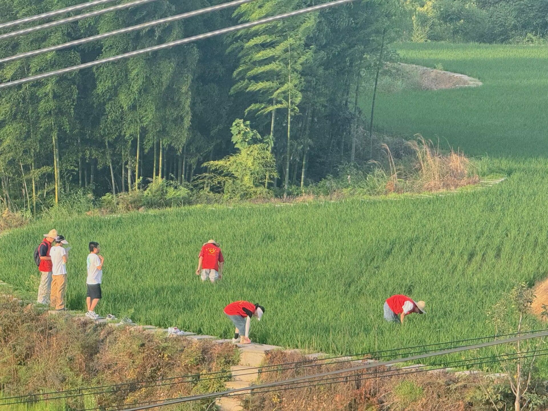 晨风拂过稻浪,青翠的田野泛起层层涟漪。站在田埂上的志愿者们却面露难色——“怎么办?我没下过田。”“田里会不会有虫子啊?”这样的疑问萦绕在每一个志愿者的心头。那怎么办?“干!”下田不是选择题,而是必答题!队长杨锦宏果断地脱下鞋袜、挽起裤脚,第一个踏入水田,浑浊的泥水瞬间漫过脚踝,溅起的泥点在他裤腿上绽放出奋斗的印记。队员们紧随其后,分开行动。从生涩到熟练,从举步维艰到行动自如,志愿者们始终埋头苦干,小心翼翼地避开每一株稻谷。岸边的村委干部田文景看着这群青年学子从畏缩到投入的转变,不禁竖起大拇指,高度肯定志愿者们肯吃苦、敢实践的精神,直言乡村振兴就需要这样既有知识又接地气,知行合一的大学生。