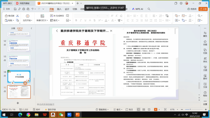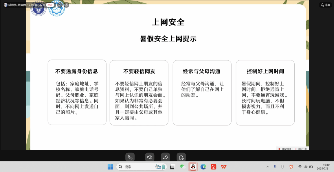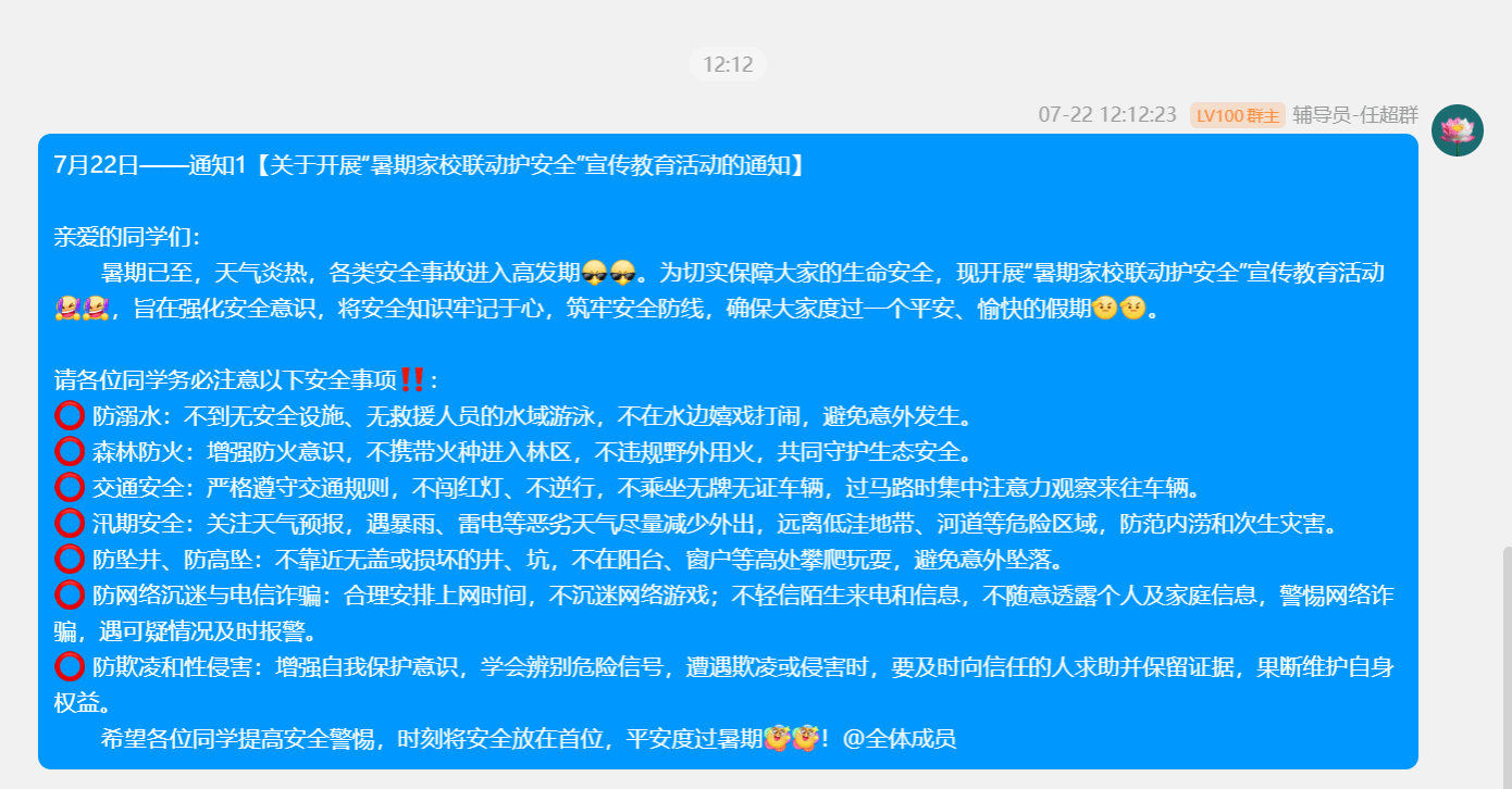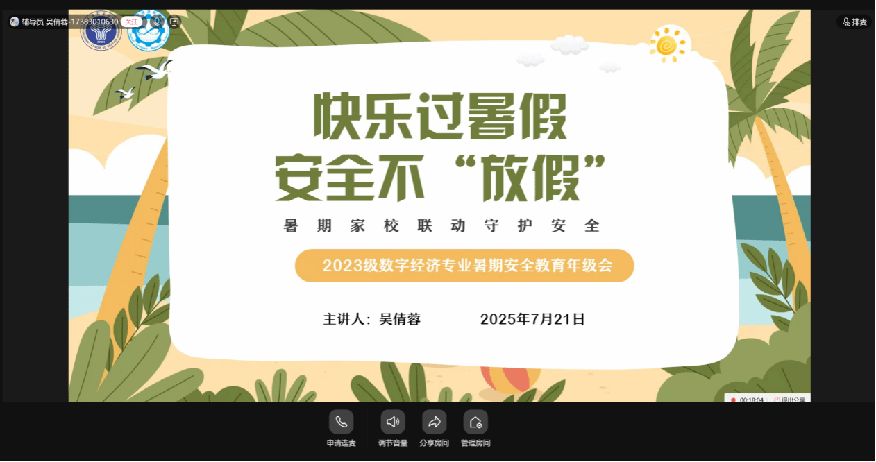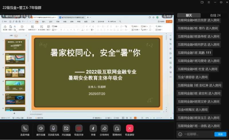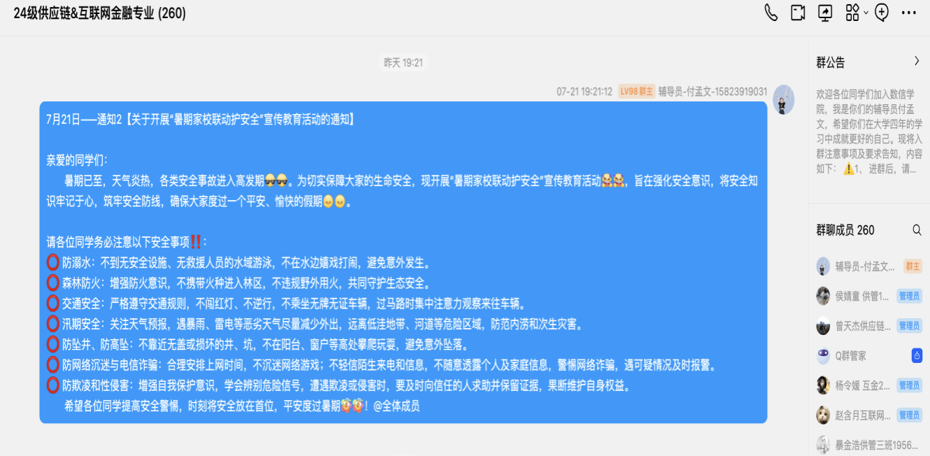 2025年7月20日至22日,数字经济商学院集中开展“暑期家校联动护安全”宣传教育活动。全体14名辅导员依托腾讯会议、QQ群课堂等线上平台,通过主题年级会、班会等形式,实现了全院学生安全教育全覆盖的目标。
