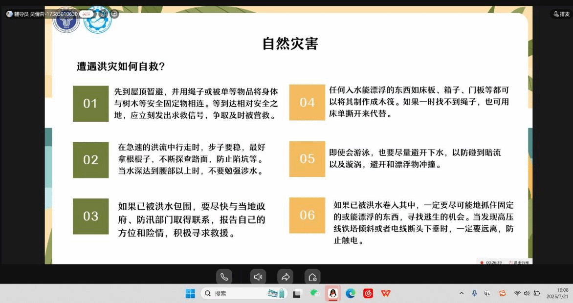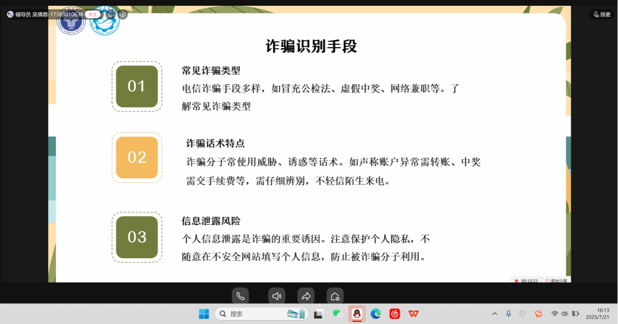 辅导员团队围绕暑期高发风险领域开展系统化、场景化安全教育。在防溺水教育中,严控私自下水行为,明确“家长陪同制”,详细讲解安全水域清单与智慧救援知识;针对高温防护深入解析中暑预防及热射病应对要点,强调避开10:00-16:00高温时段出行,并传授科学补水与物理降温方法;交通安全方面推行骑行头盔“强制佩戴”制度,结合交通案例VR模拟警示危险驾驶行为;网络安全教育中建立反诈信息共享机制,普及个人信息加密指南与诈骗信息速报流程。