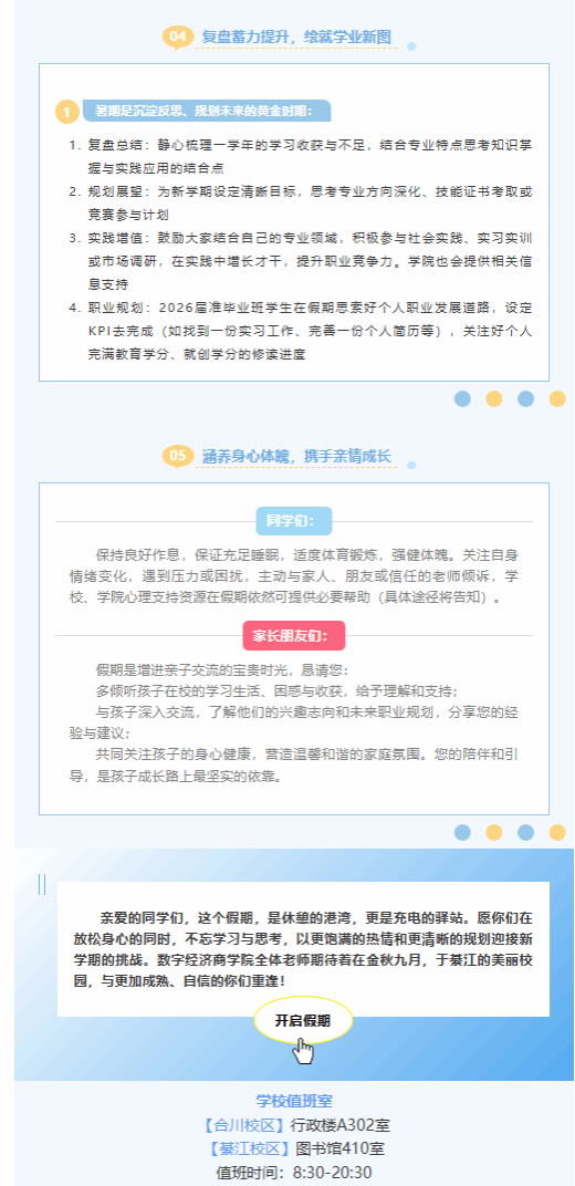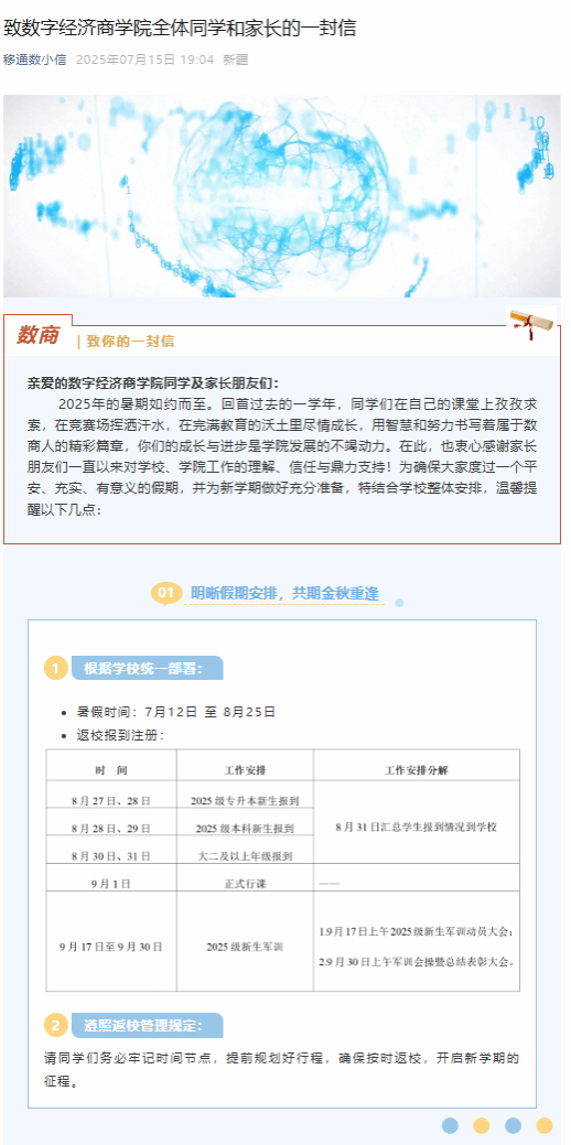 通过系统化教育,学生安全防范意识与应急能力显著提升,“安全第一”“生命至上”理念深入人心。我院于7月15日通过官方微信公众号发布《致数字经济商学院全体同学和家长的一封信》,号召家长共同参与安全监护,明确假期安全、学业提升、职业规划等要求,正式开启“学校-家庭”双向保障模式,为后续安全教育奠定了坚实基础,为学子平安度假构筑坚实防线,更为其新学期的扬帆起航注入清晰规划与充足动力。