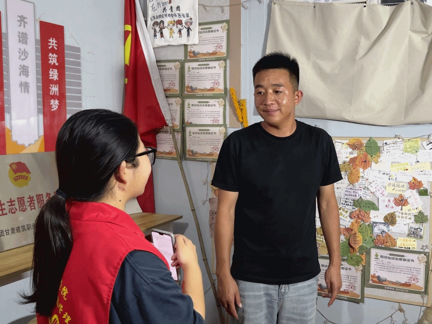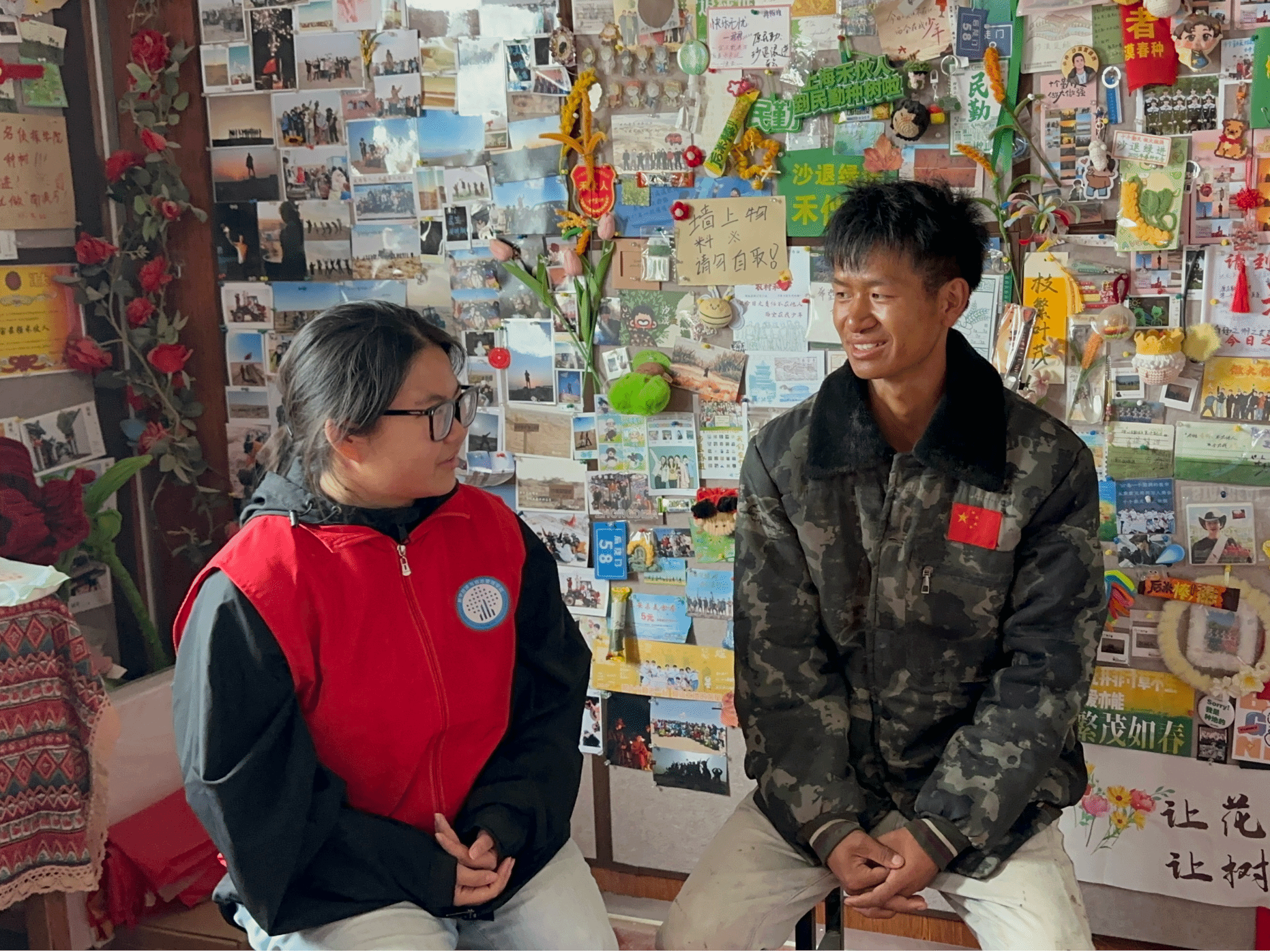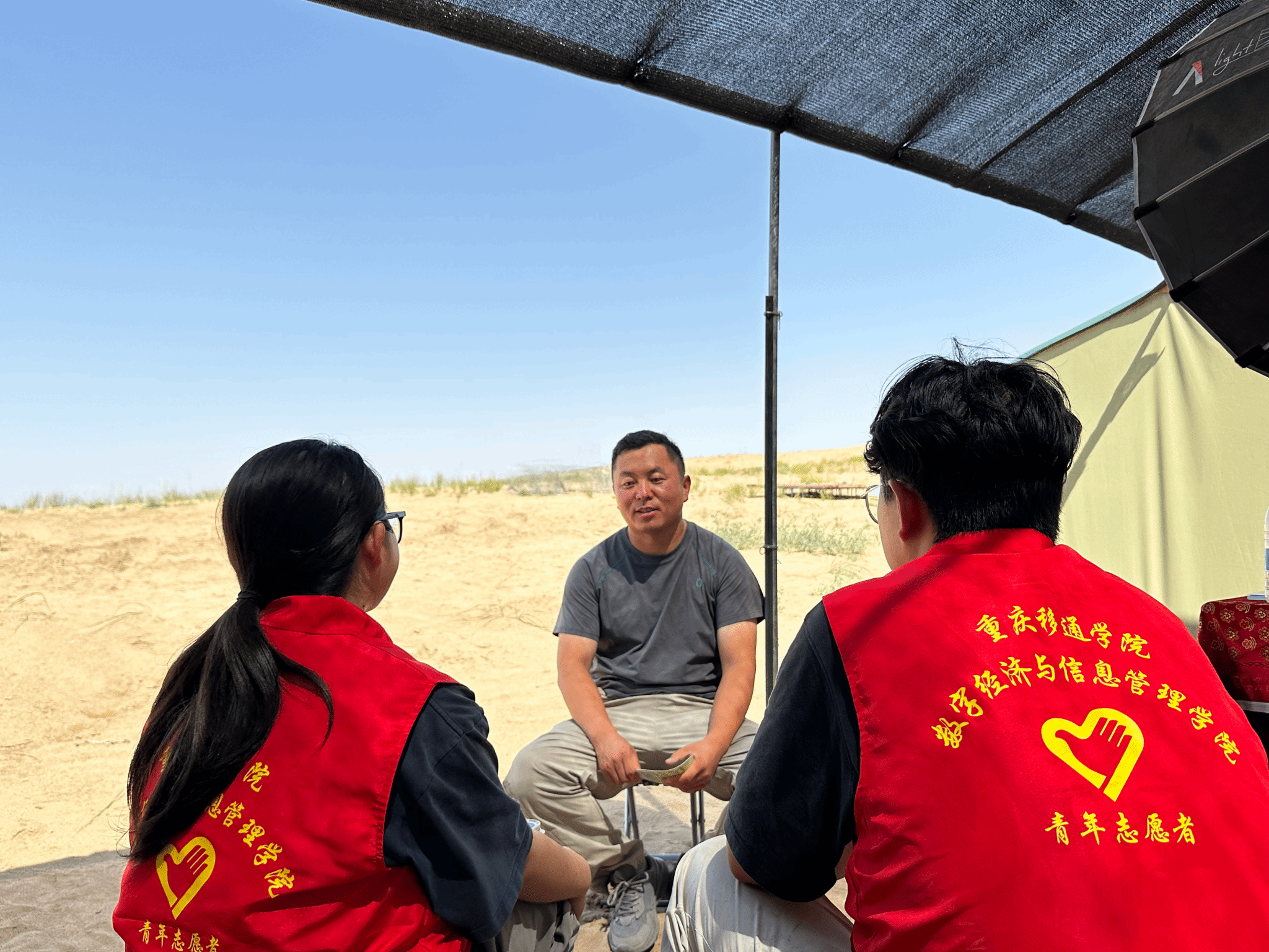 来自云南的小祥哥是基地后勤保障的核心人物,承担着检查线路、维修帐篷、安排住宿等维系基地正常运转的关键任务。在一场突如其来的沙尘暴中,他秒变“定桩人”,不顾如注般“泼天”的狂沙,声嘶力竭地逐一确认帐篷内志愿者的安全。这份守护,源自他对人与土地的深厚情感:他看到老乡为志愿者递上热馕,感受到戈壁般炽热的情谊;即便记不全每位志愿者的名字,可那份牵挂从未缺席。凝望基地四周渐生的绿意,他深知,这片土地正被无数双手共同稳稳守护。