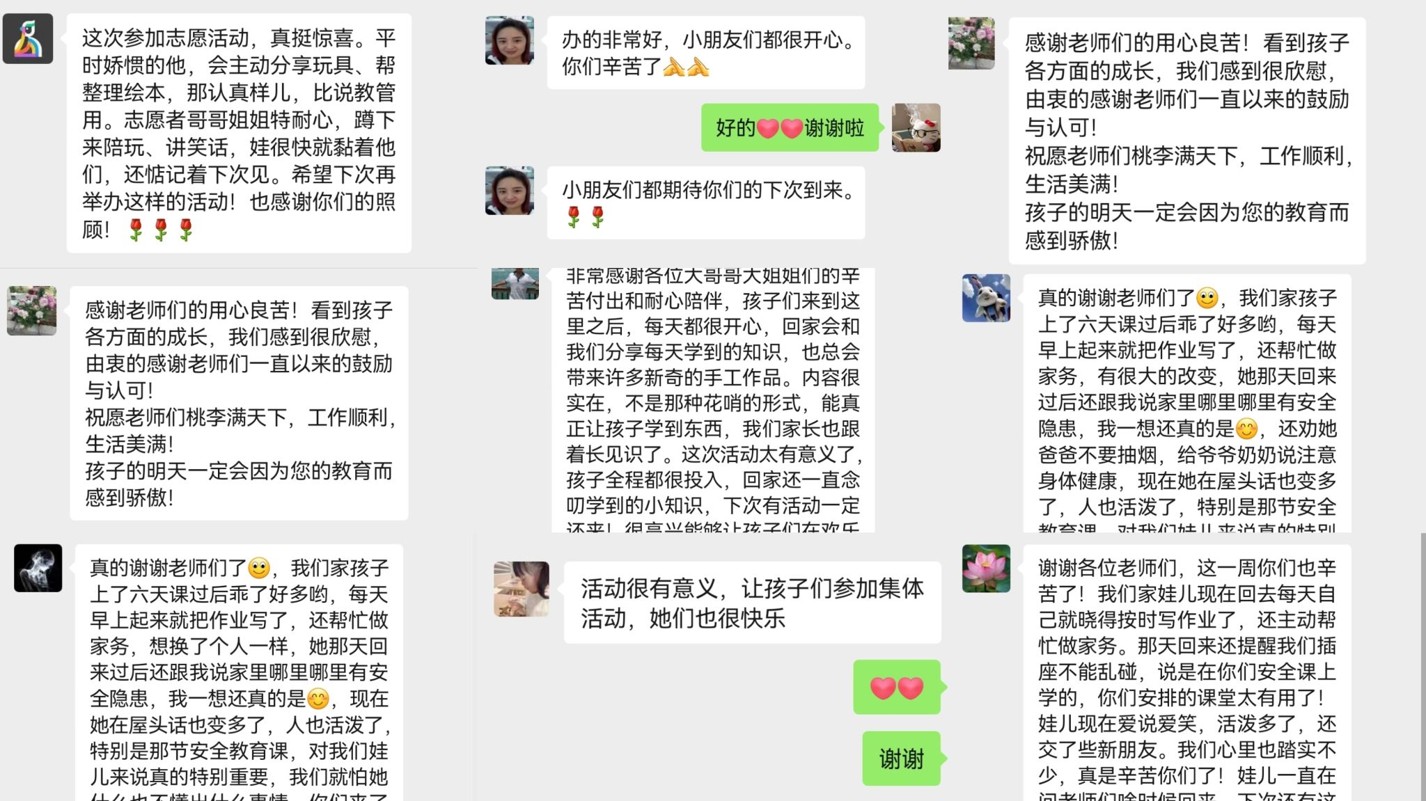 活动结束后,家长们的感谢在社区微信群里接连弹出:“孩子们带回的不仅是手工作品,还有说不完的新鲜事,每天都盼着去上课”“志愿者老师太用心了,孩子现在出门会提醒我们‘看红绿灯’,还知道‘中药能治病’”……字里行间满是对活动的认可,不少家长还附上孩子在家展示作品的照片,群里的点赞和感谢表情包刷屏不断。